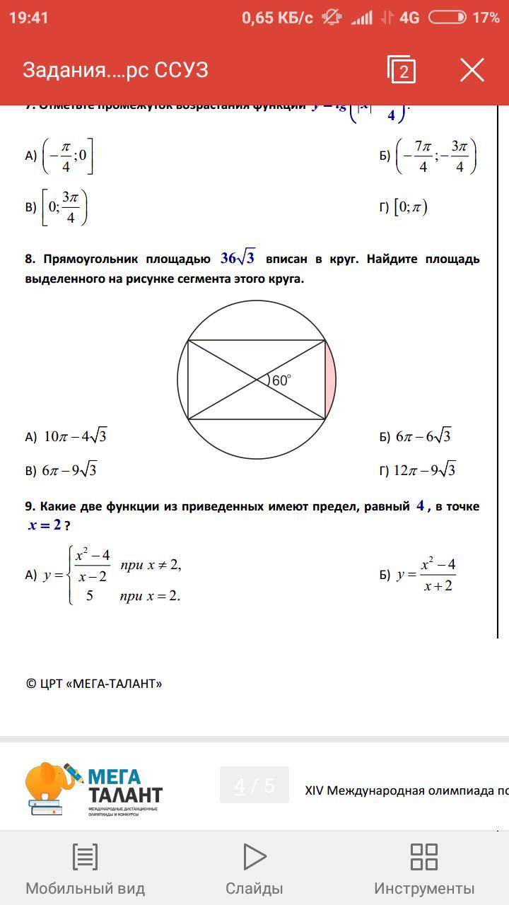 4. Площадь выделенного на рис. сегмента равна 6π-9√3