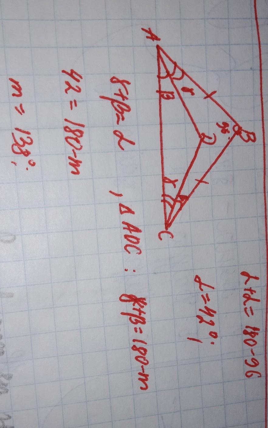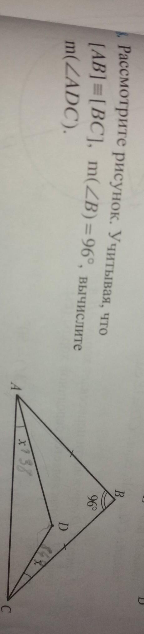 Кут ADC=48, так як трикутник рівносторонній, а кут даний 96 і якщо провести пряму АD то вона буде мередіаною ВС, тому 96:2=48