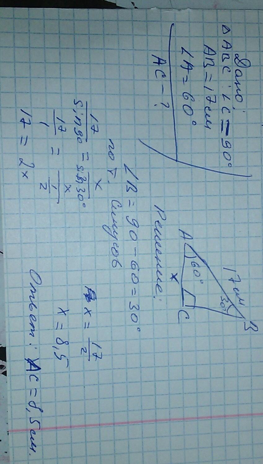 В прямоугольном треугольнике АВС гипотенуза АВ равна 17 см, угол А равен 60 градусам. Найти сторону АС.
