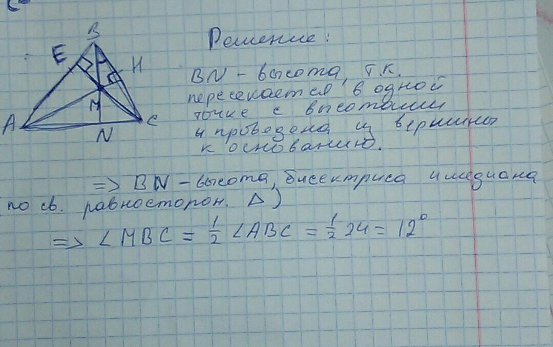 Высоты, проведенные к боковым сторонам AB и BC равнобедренного треугольника ABC, пересекаются в точке M. Прямая BM пересекает основание AC в точке N. Определи угол CBM, если угол ABC=24