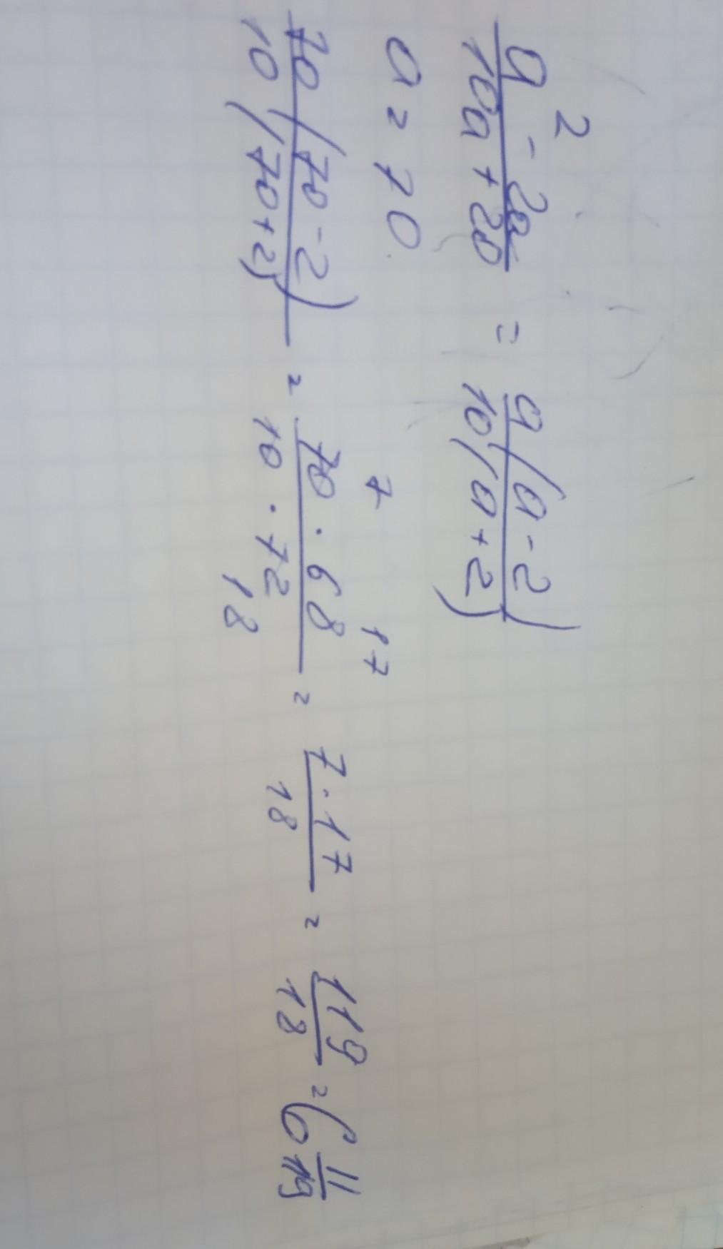(а²-2а)/(10а+20)=70*68/(10*70 +20)= 4760/720= 6 11/18