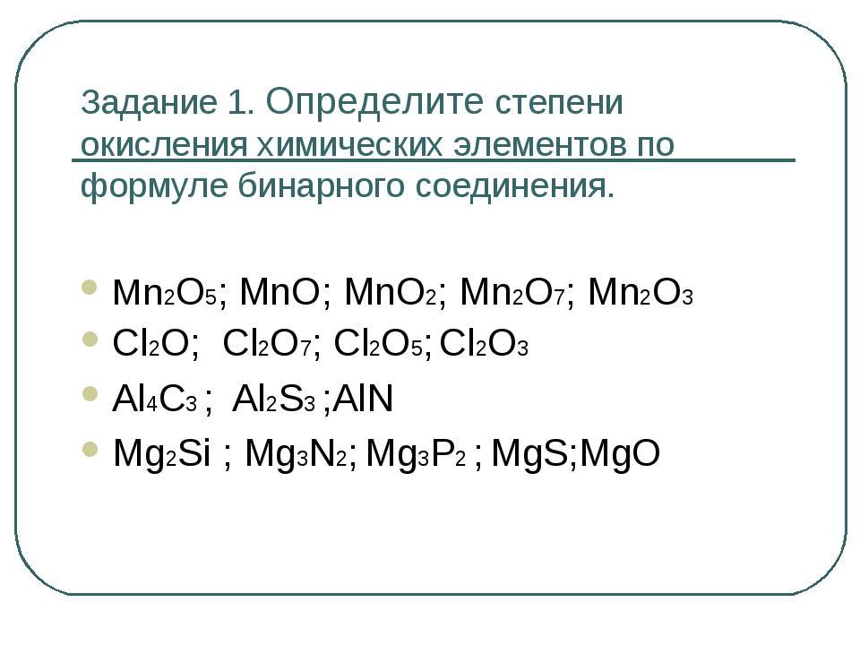 1) Mn(+5)O(-2), Mn(2+)O(-2), Mn(+4)O(-2), Mn(+7)O(-2), Mn(+3)O(-2)