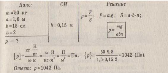 теперь найдем силу давления на лыжи F=mg= 55кг *9,8м/c^2= 539 Н