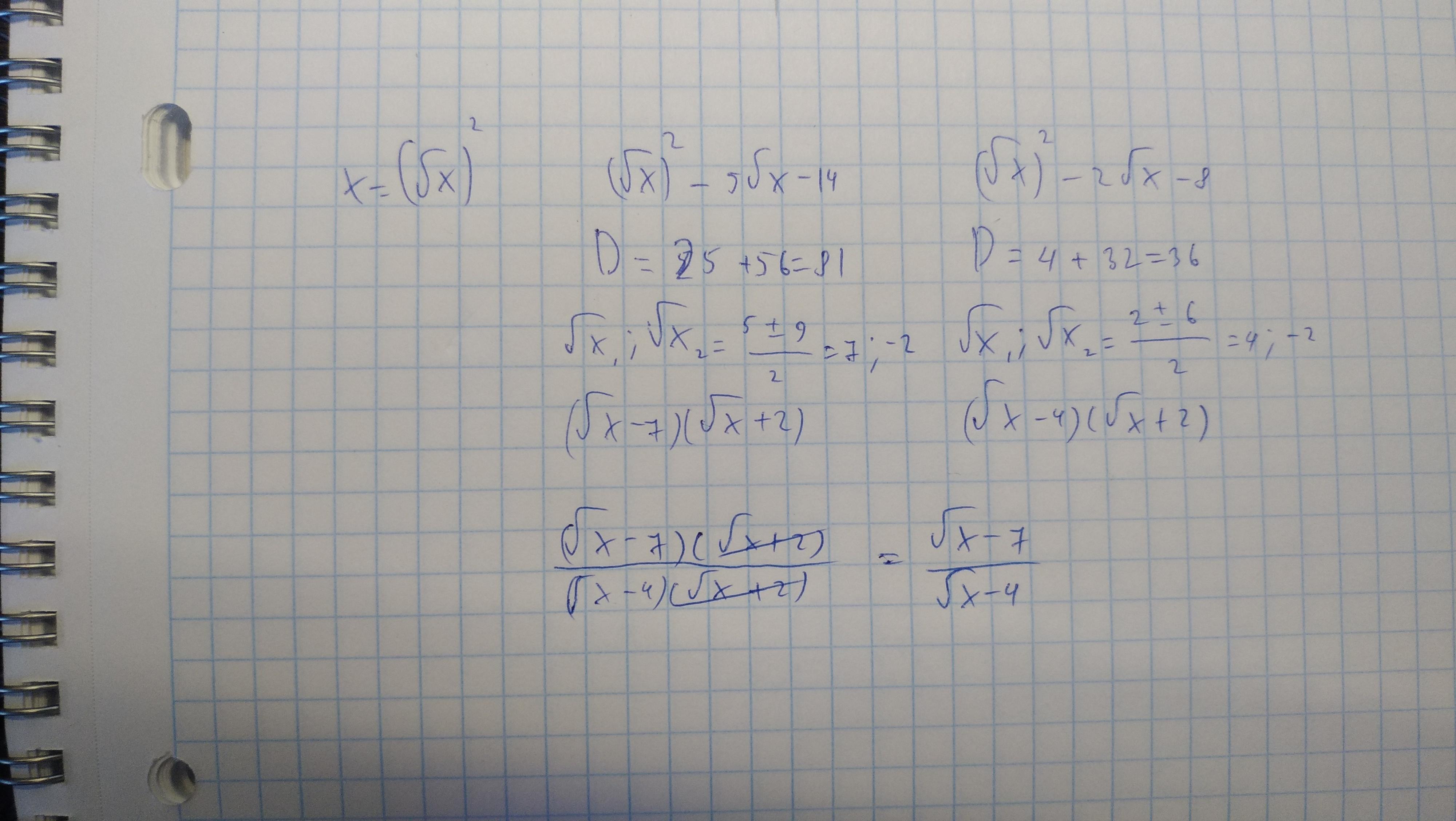(x - 5√x - 14) / ( x - 2√x - 8) = (√x + 2)(√x - 7) / (√x - 4)(√x + 2) =