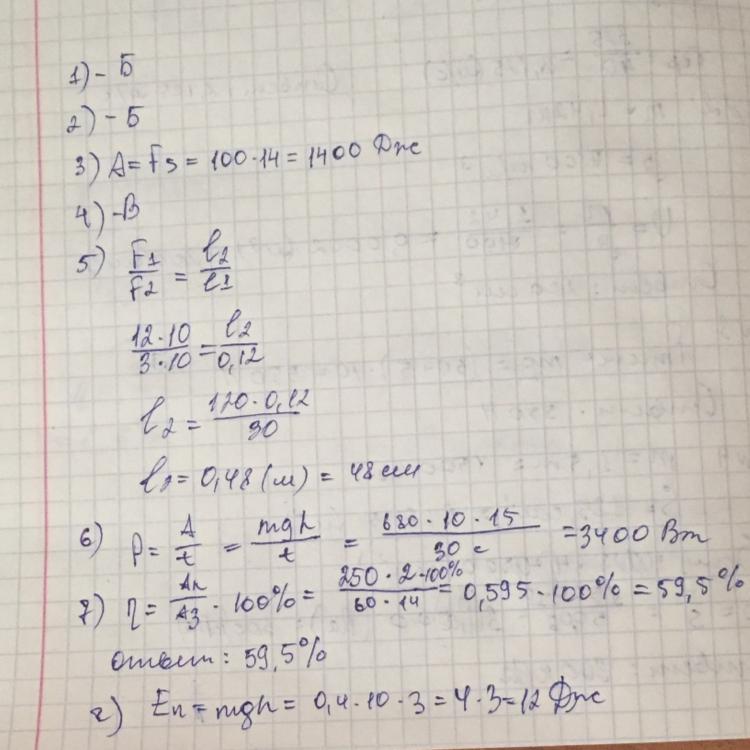 7)Найти КПД наклонной плоскости высотой 2 м и длиной 14 м, если для подъема груза 250 Н была приложена сила 60 Н.
