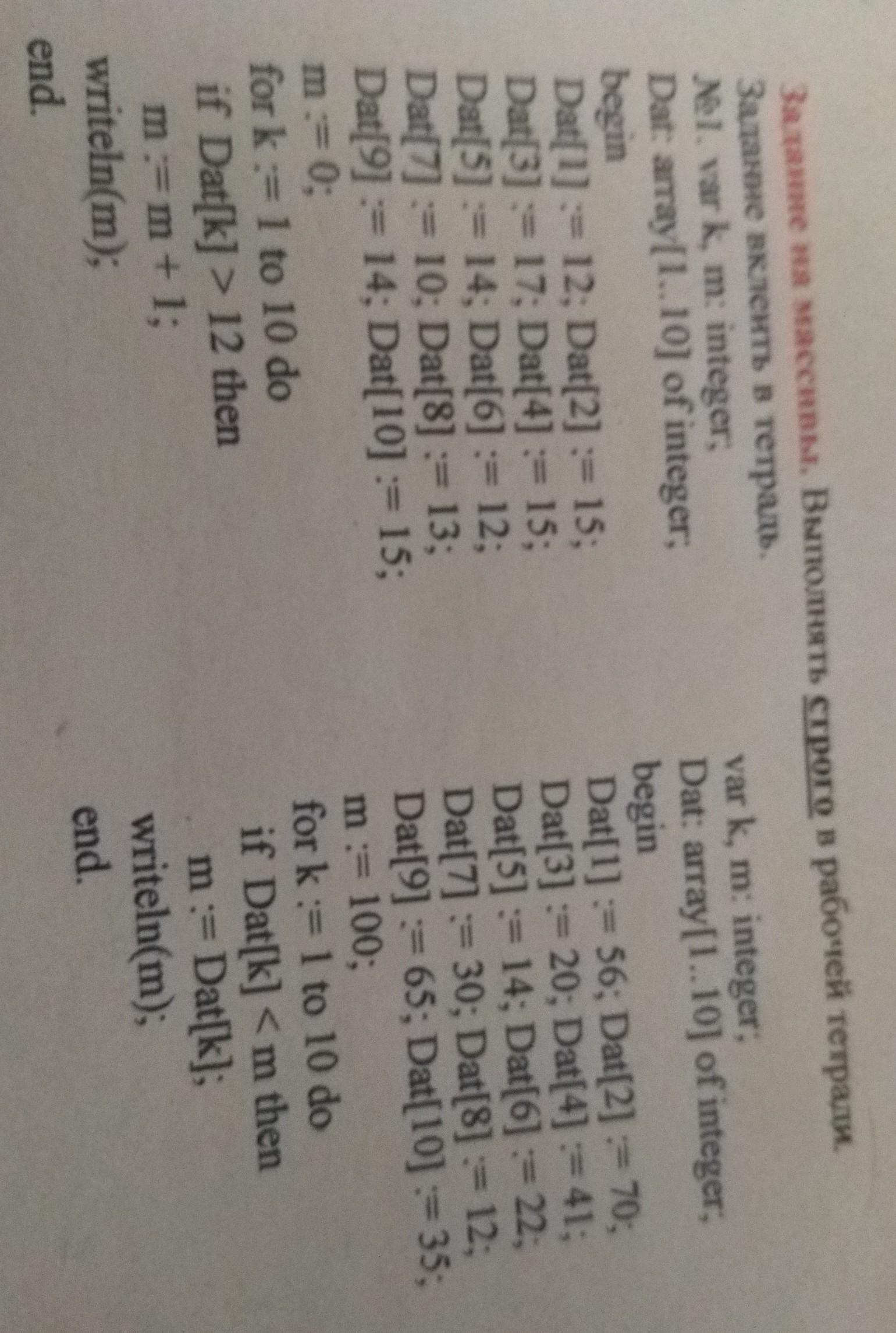 Суть программы следующая: у нас есть массив Dat, состоящий из 10 элементов. Значения каждого элемента нам уже известно, ведь их ввели прямо в коде программы. И так, цикл for k:=1 to 10 do проверяет, больше ли текущий элемент массива, чем 12, если да, то переменная m увеличивается на 1