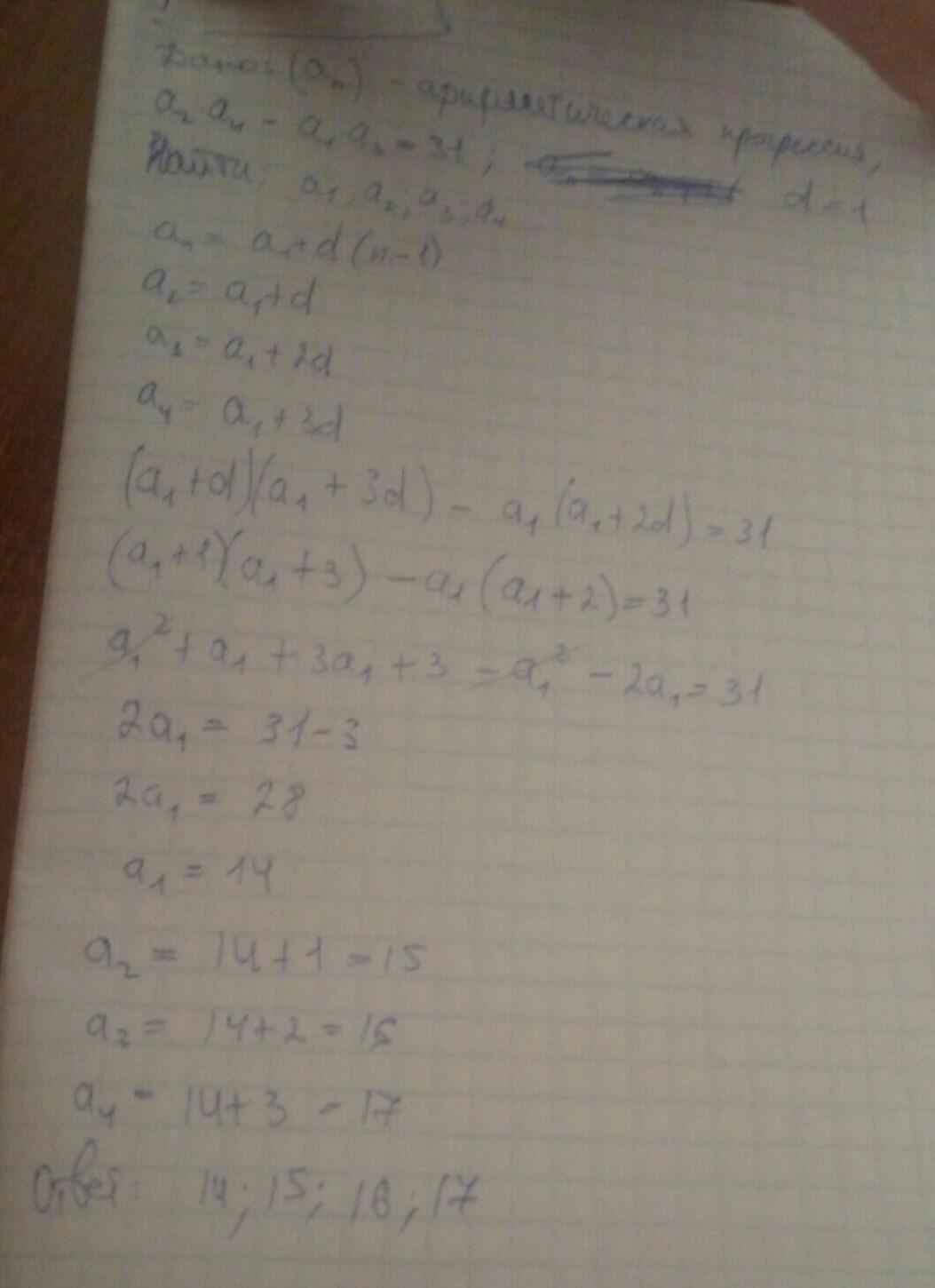 Найдите четыре последовательных натуральных числа таких, что произведение второго и четвёртого из этих чисел на 31 больше произведения первого и третьего.