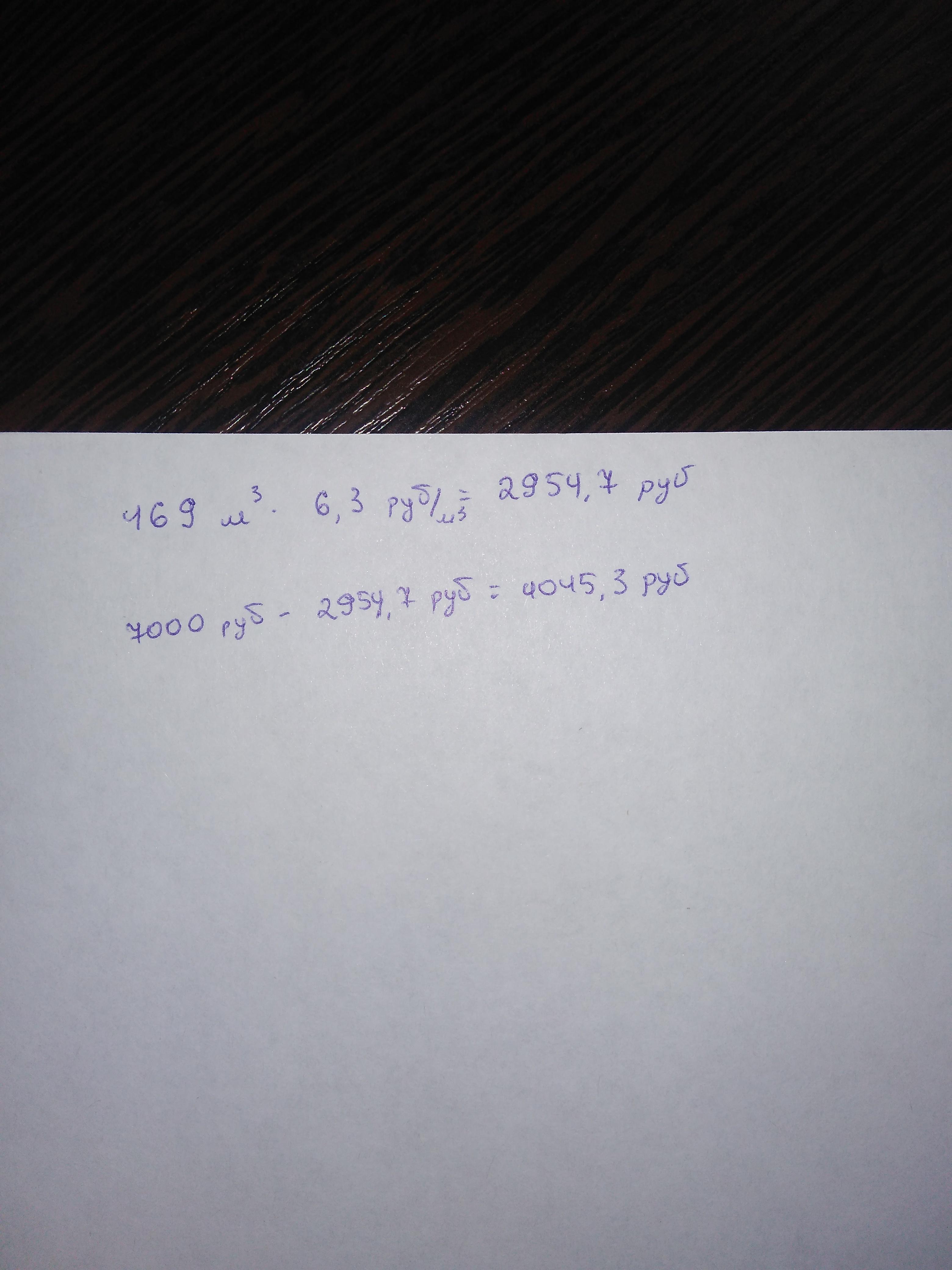 Потребитель израсходовал на отопление дома 469 кубометров газа. Стоимость одного кубометра газа составляет 6,3 руб. В начале месяца он внёс предоплату на счёт энергоснабжающей компании 7000 руб. В конце месяца произведено списание средств за потреблённый газ. Рассчитай остаток средств на счету клиента после произведённого списания.
