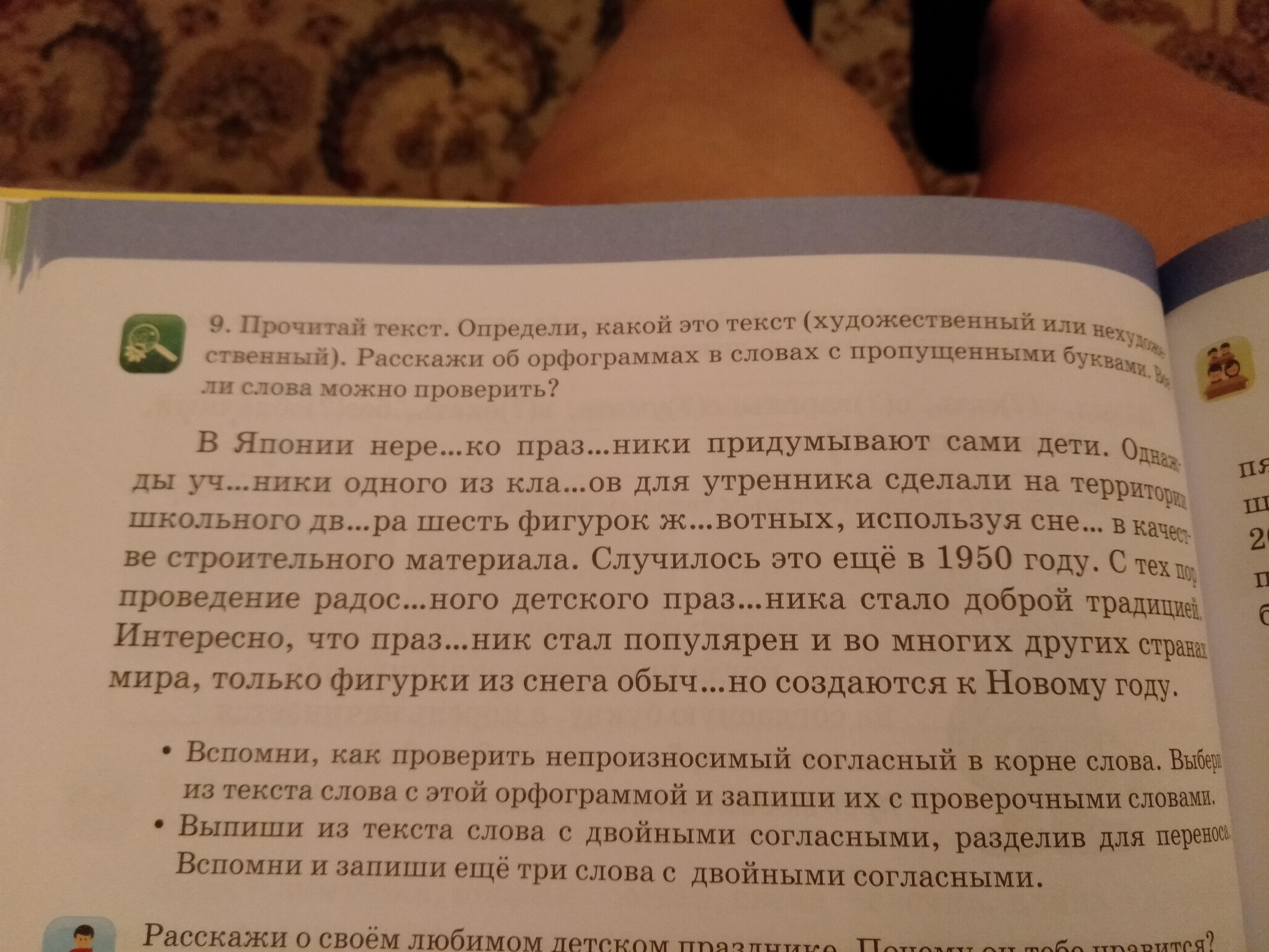 В Японии нередко (пров.слово-редок) праздники(есть старинное пров. слово-празден, но во многих словарях слово праздник словарное) придумывают сами дети. Однажды ученики (пров. слово-учеба) одного из классов (словарное слово) для утренника сделали на территории школьного двора (пров. слово-двор) шесть фигурок животных(жи, ши с буквой и), используя снег(пров. слово-снегирь, снегоход) в качестве строительного материала. Случилось это ещё в 1950 году. С тех пор проведения радостного (пров. слово-радость) детского праздника (празден или слов. слово) стало доброй традицией. Интересно, что праздник (празден или слов. слово) стал популярен и во многих других странах мира, только фигурки из снега обычно(чк, чн без ь) создаются к Новому году.