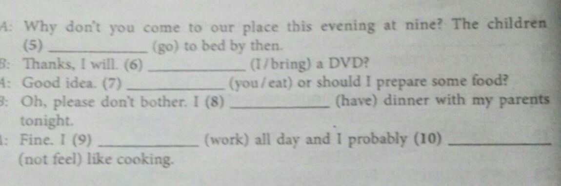 A: Fine. I (9) (have been working) all day and I probably (10) (won't feel) like cooking.