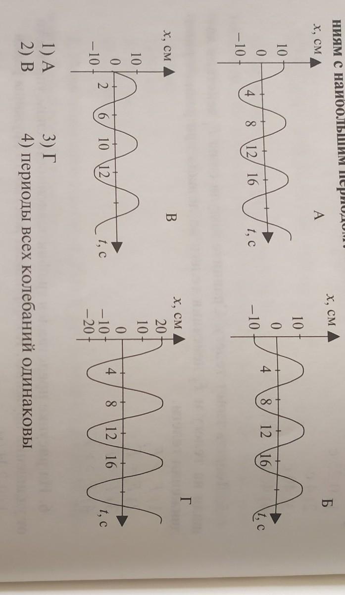 На рисунке представлены графики изменения смещения колеблющихся тел от времени.Какой рисунок соответствует колебаниям с наибольшим периодом?