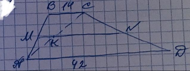 Объяснение: большее основание трапеции 42, средняя линия отсеченного от трапеции диагональю большего треугольника равна 21-это больший из отрезков , на которые делит среднюю линию от трапеции диагональ . меньший-28-21=7