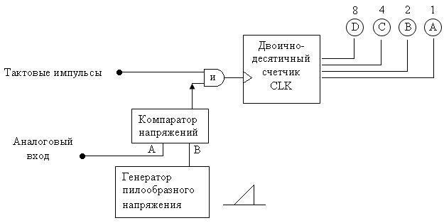 Суть работы оцифровки в том, что с помощью генератора образцового напряжения и тактового генератора мы с определенной высокой частотой сравниваем уровень входного сигнала с уровнем "пилы" и по времени задержки совпадения уровней (равному количеству тактов генератора тактовых импульсов) определяем уже в цифровом виде уровень сигнала.
