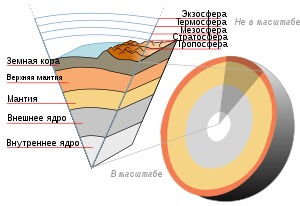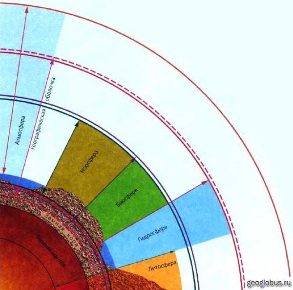 Земля имеет 6 оболочек: атмосферу, гидросферу, биосферу, литосферу, пиросферу и центросферу.