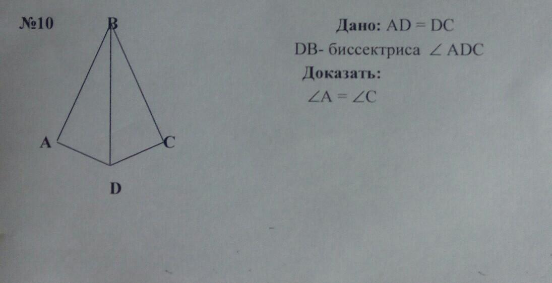 Можно представить что это два Δ, докажем что эти треугольники равны: Т.к. BD общая сторона и биссектриса ∠ADC ⇒ углы ADB и CDB равны, ⇒ треугольники равны, и из этого следует что ∠A=∠C