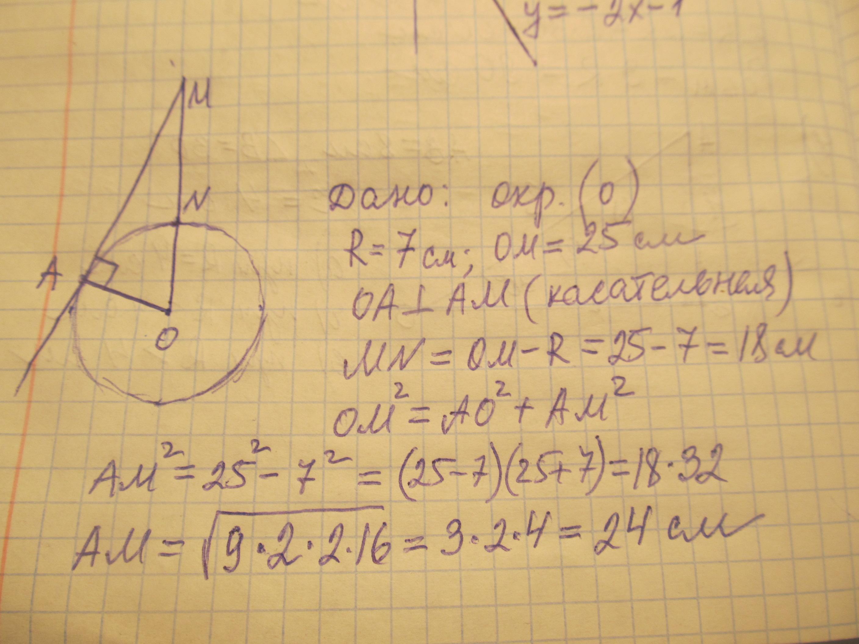 Расстояние от точки M до центра O сферы с радиусом 7 см равно 25 см. Найдите расстояние от данной точки до точки A касания MA и сферы