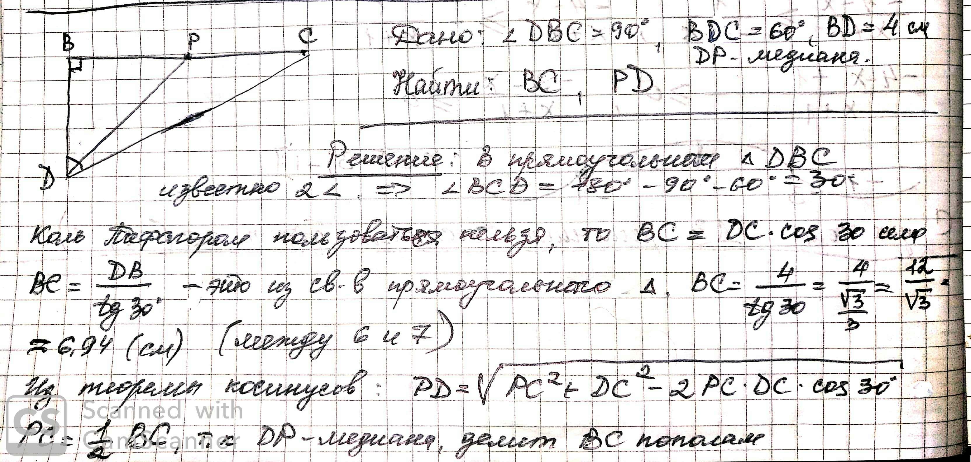 Дано: угол DBC = 90 градусов, угол BDC = 60 градусов, BD = 4 см.