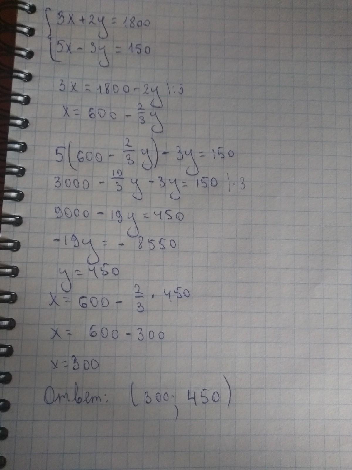 За 3 кг мандаринов и 2 кг апельсинов заплатили 1800 тг. Сколько стоит 1 кг каждого вида фруктов,если 3 кг апельсинов на 150 тенге дешевле чем 5 кг мандаринов? Если можно пришлите фото сделанного вами задания,дам 25 баллов