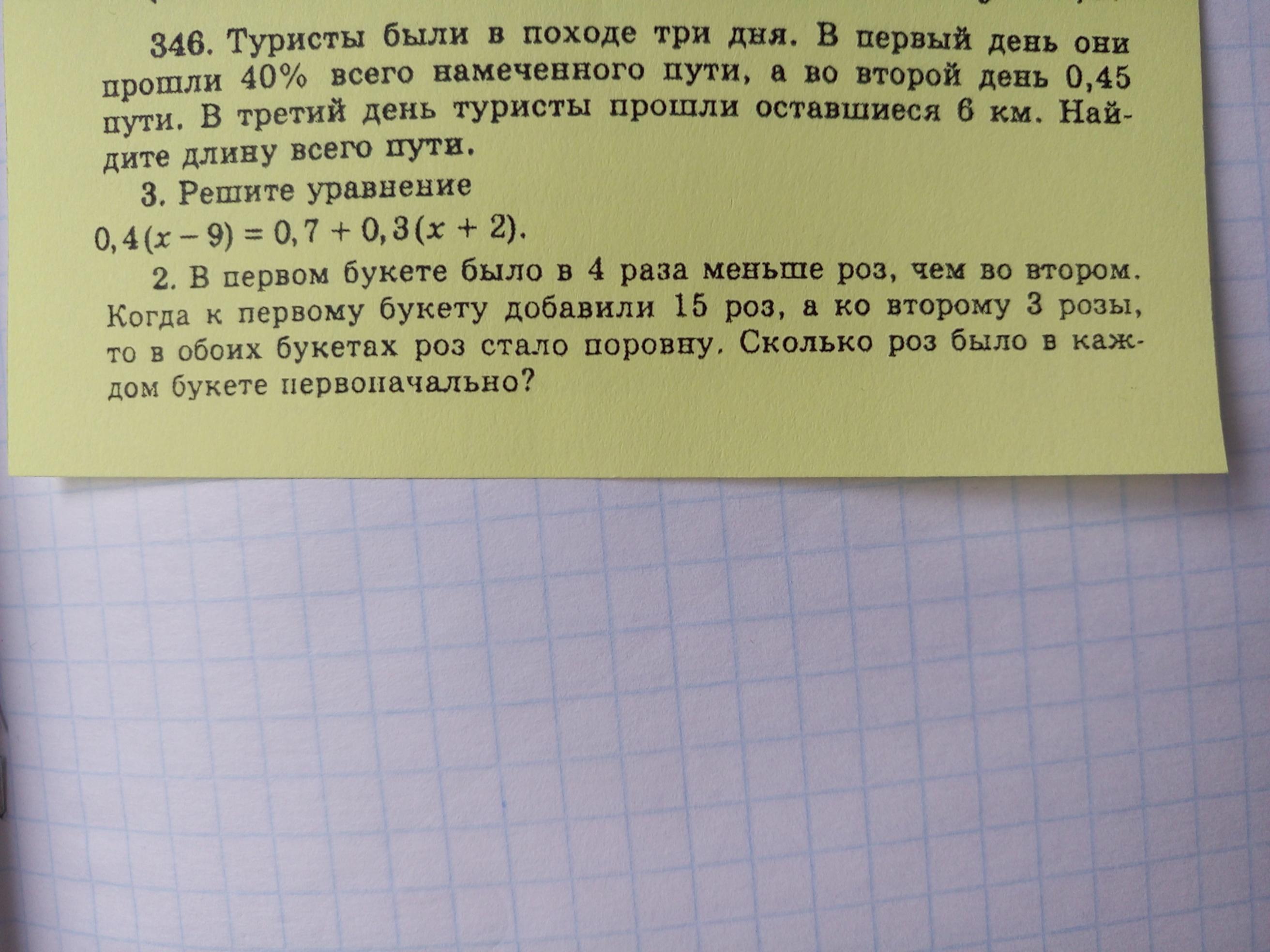 1)В третий день туристы прошли 1-0,4-0,45=0,15 что составляет 6 км весь путь 6:0,15=40(км)