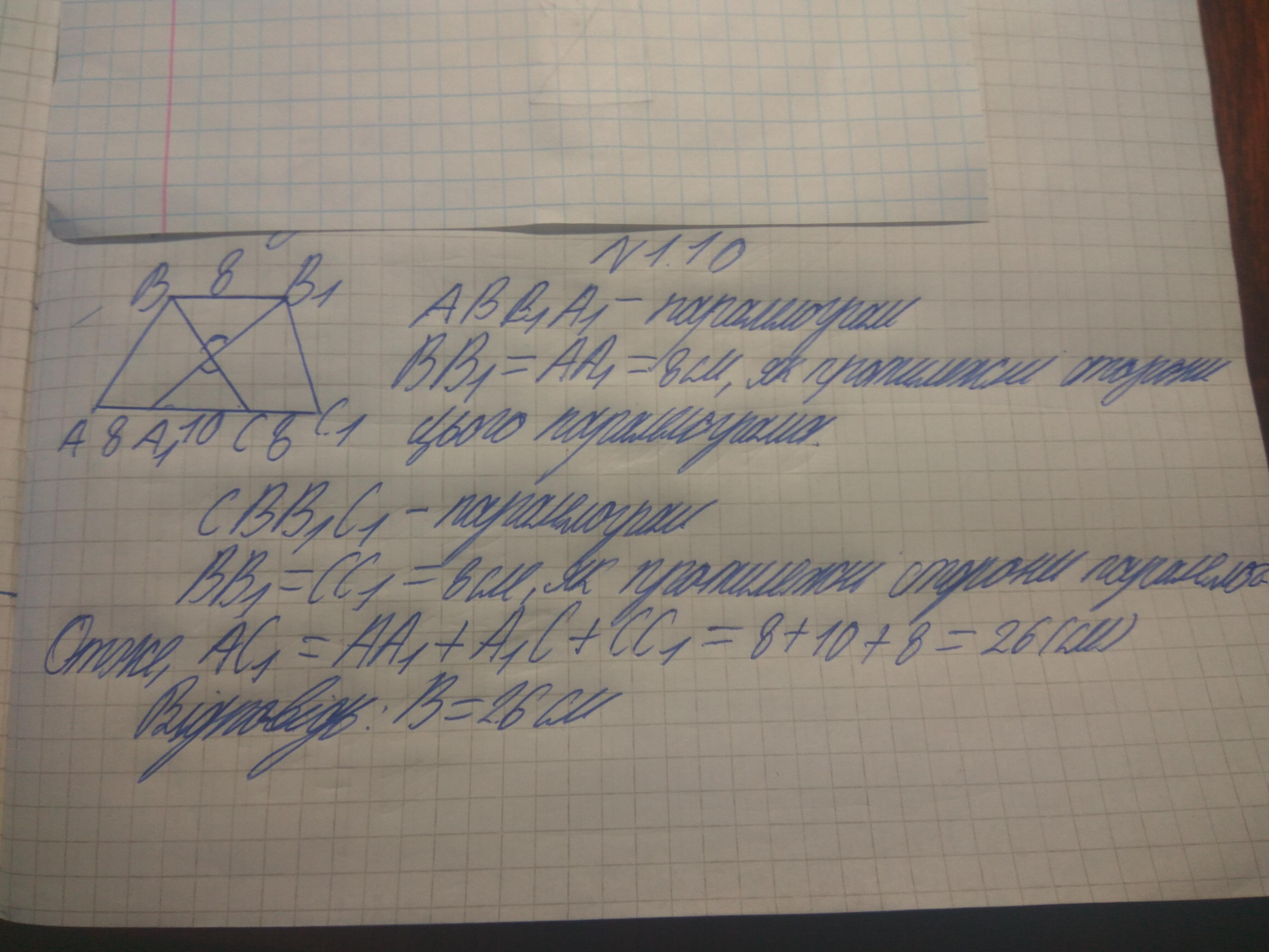Трикутники АВС і А1В1С1, зображені на рисунку,рівні,причому АВ=А1В1, ВС=В1С1. Знайдіть відстань між точками А і С, якщо ВВ1=8 см, А1С=10см.