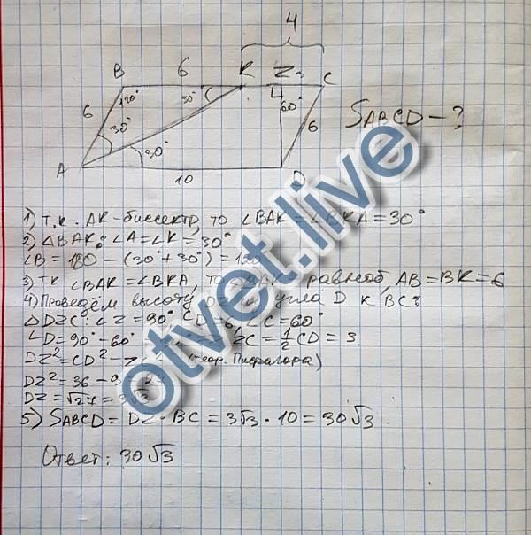 ABCD-параллелограмм мера угла А=60 биссектриса угла А делит диагональ ВD,в точке К,ВК=2см КD=4см.Найдите площадь...