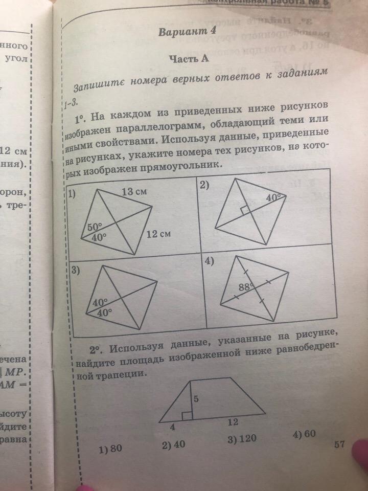 На каждом из этих рисунках изображен параллелограмм, обладающий теми или иными свойствами. Используя данные, изображенные на рисунках найдите прямоугольник! Я знаю, что будет 2 и3, но почему? 20 БАЛЛОВ