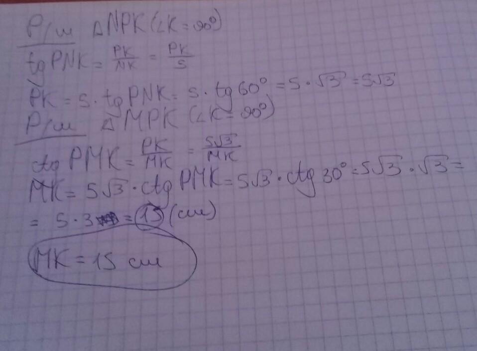 Так как угол NPK = 30 => катет NK = гипотенузе NP (по свойству прямоугольного треугольника)