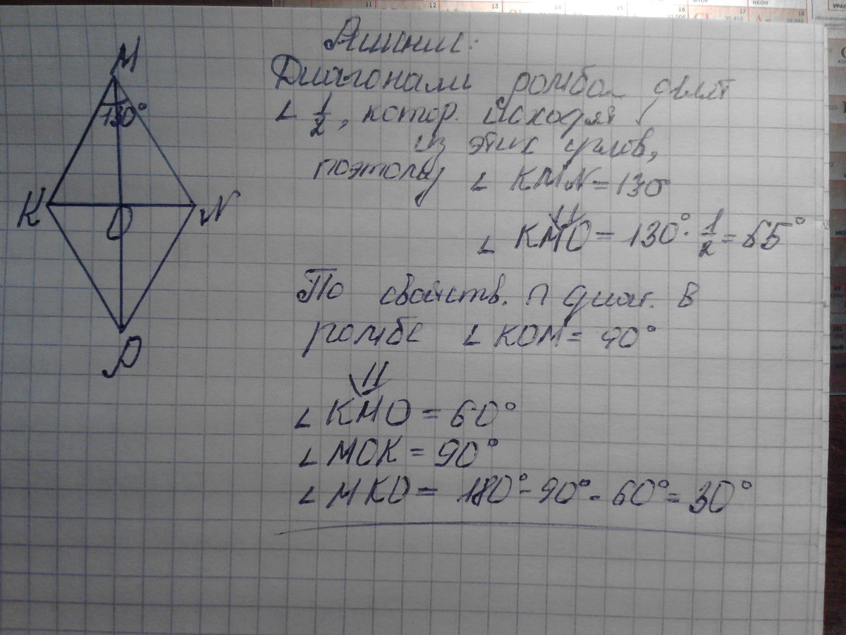 Диагонали ромба KMNP пересекаются в точке О.Найти углы треугольника KMO если угол KMN=130 градусов