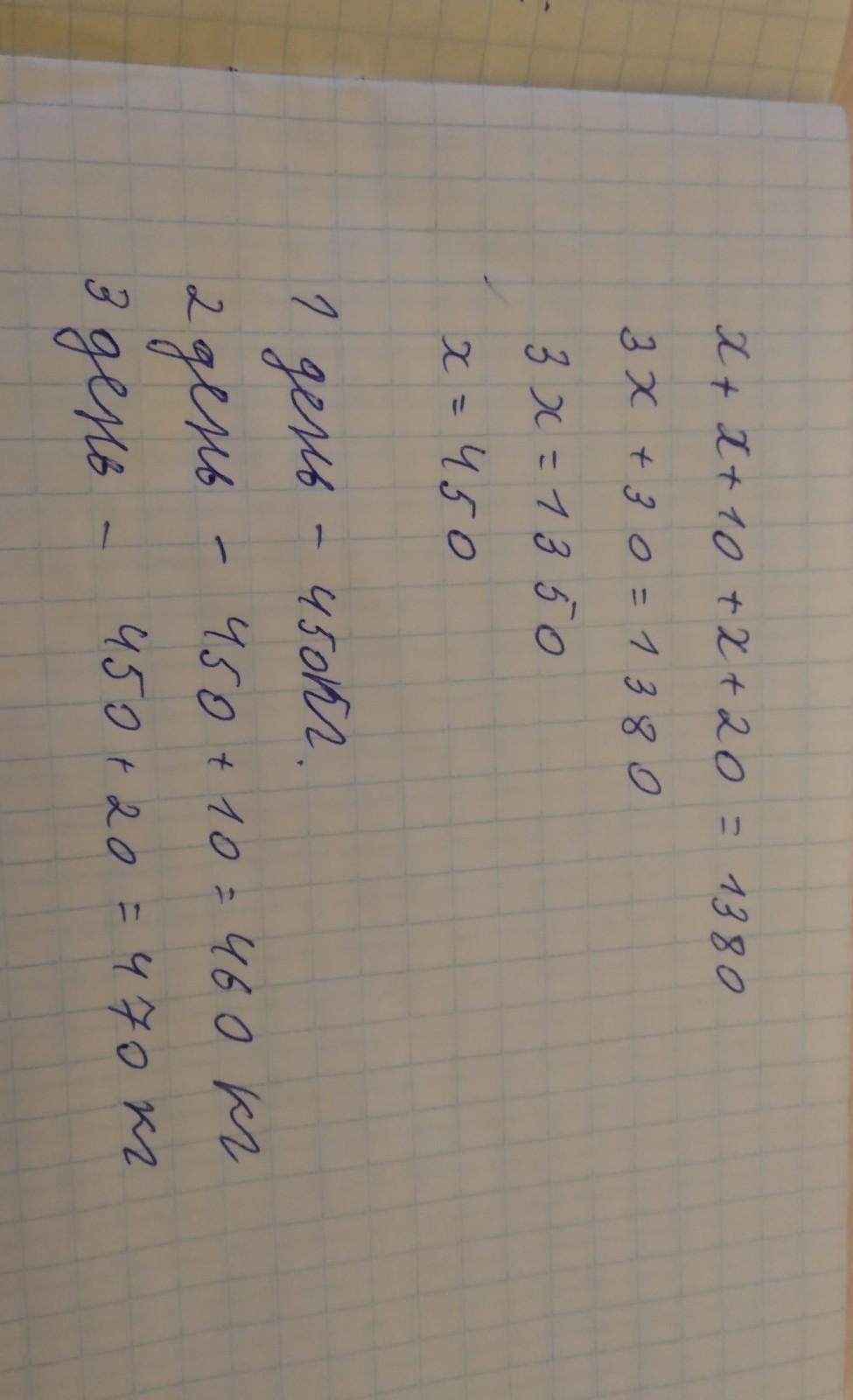 из сада србрали 1380 кг винограда.Ск кг винограда собрали в третий день ,если на след день собрали на 10 кг больше,чем в предыдущий?