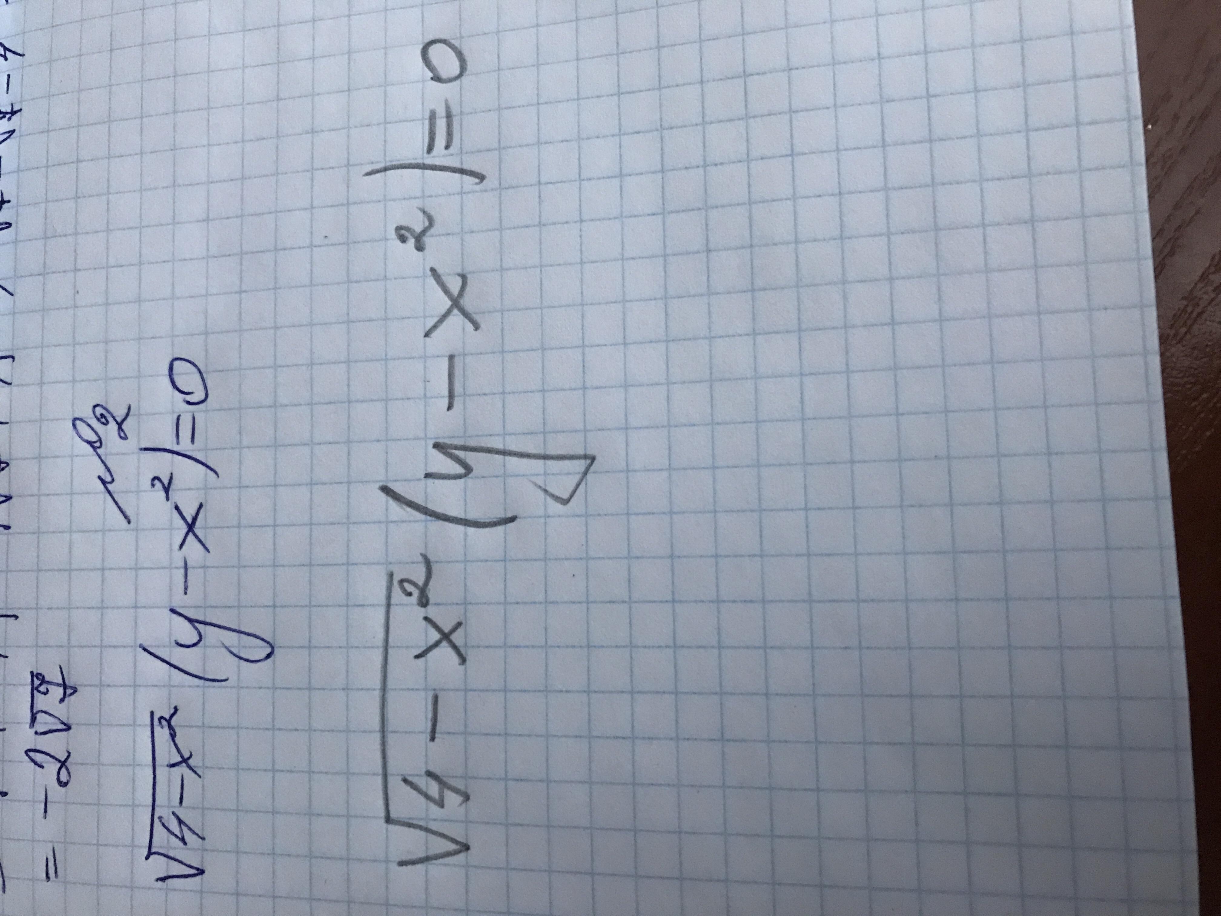 sqrt{4-x^{2}}(y-x^{2})=0\\4-x^{2}=0\\x^{2}=4\\x_{1}=-2\\x_{2}=2\\y-x^{2}=0\\y=x^{2}\\y=4