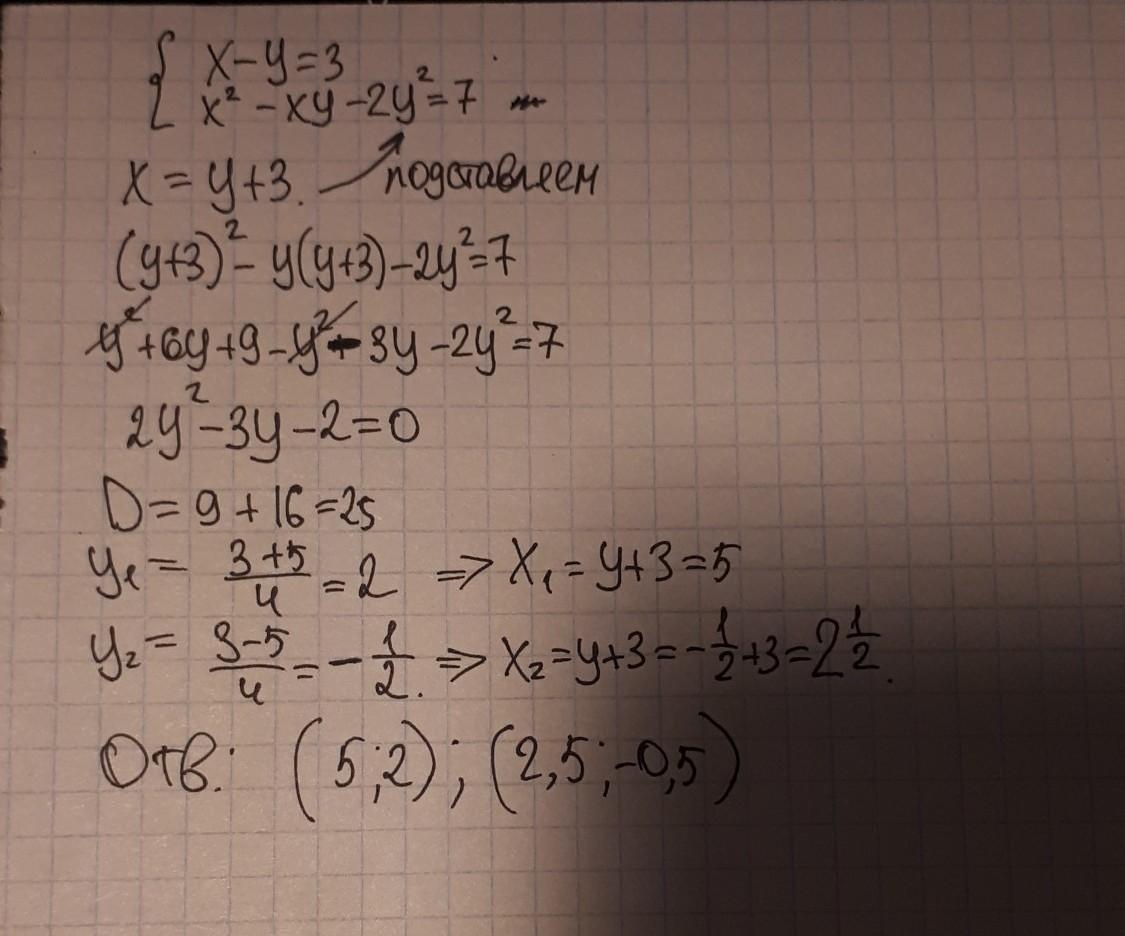 Выражаем из первой части "x", подставляем полученное во вторую часть, приводим подобные, решаем квадратное уравнение. В формулу для "x" подставляем полученные "y".