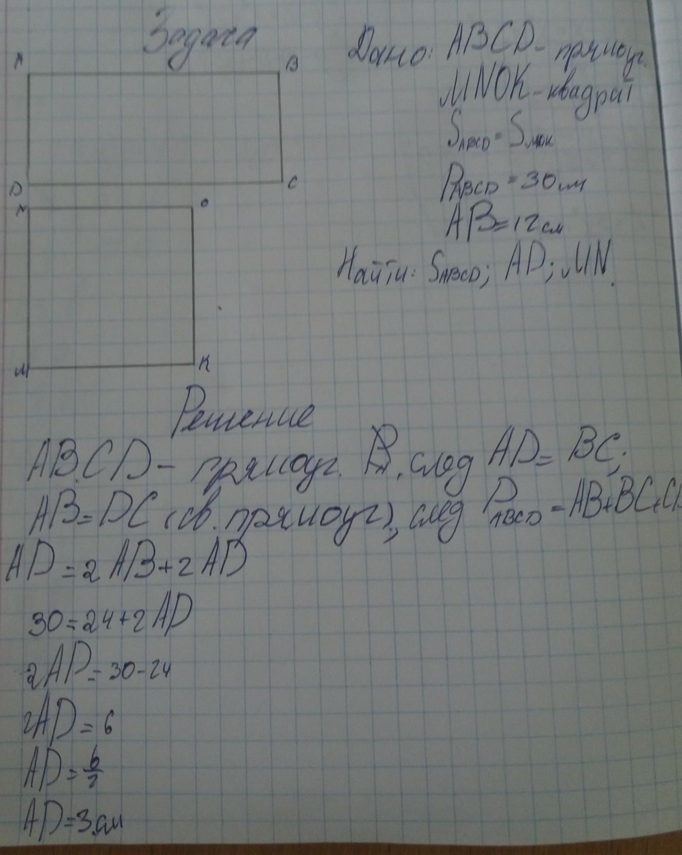 Периметр прямоугольника 30 см,одна из его сторон 12 см. Найдите другую сторону прямоугольника, площадь и сторону квадрата, равновеликого данному прямоугольнику