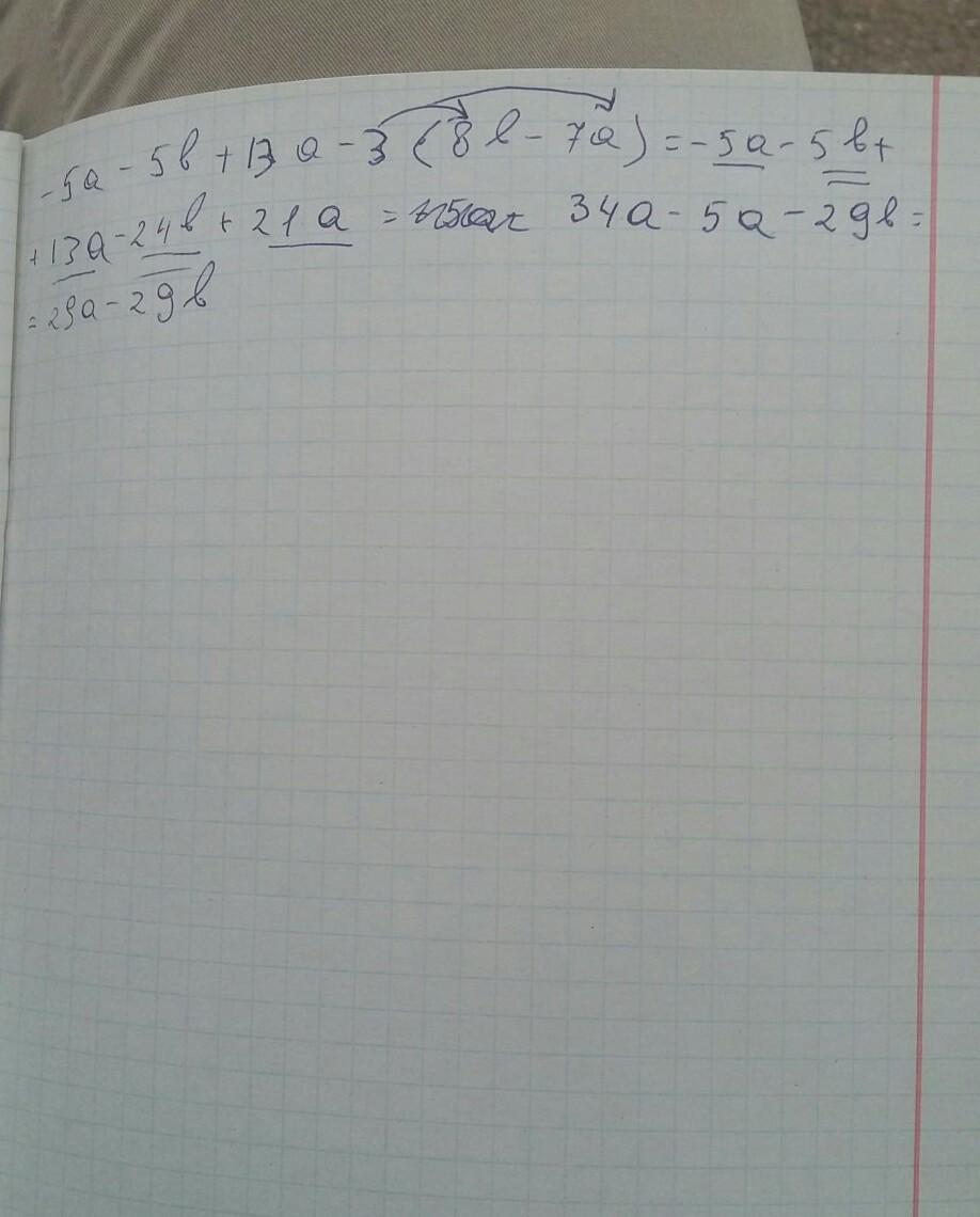 5а - 5b + 13а -3×(8b-7a)=5а-5b+13a-24b+21a=39a-29b