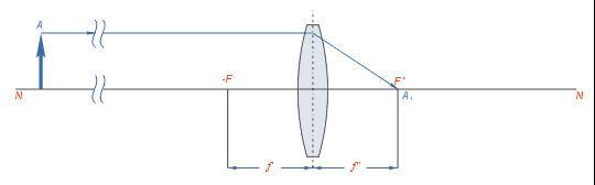Если предмет находится на бесконечно далёком от линзы расстоянии (как, например, Солнце), то его изображение получается в заднем фокусе линзы F’ действительным, перевёрнутым и уменьшенным до подобия точки. (см. рис.)