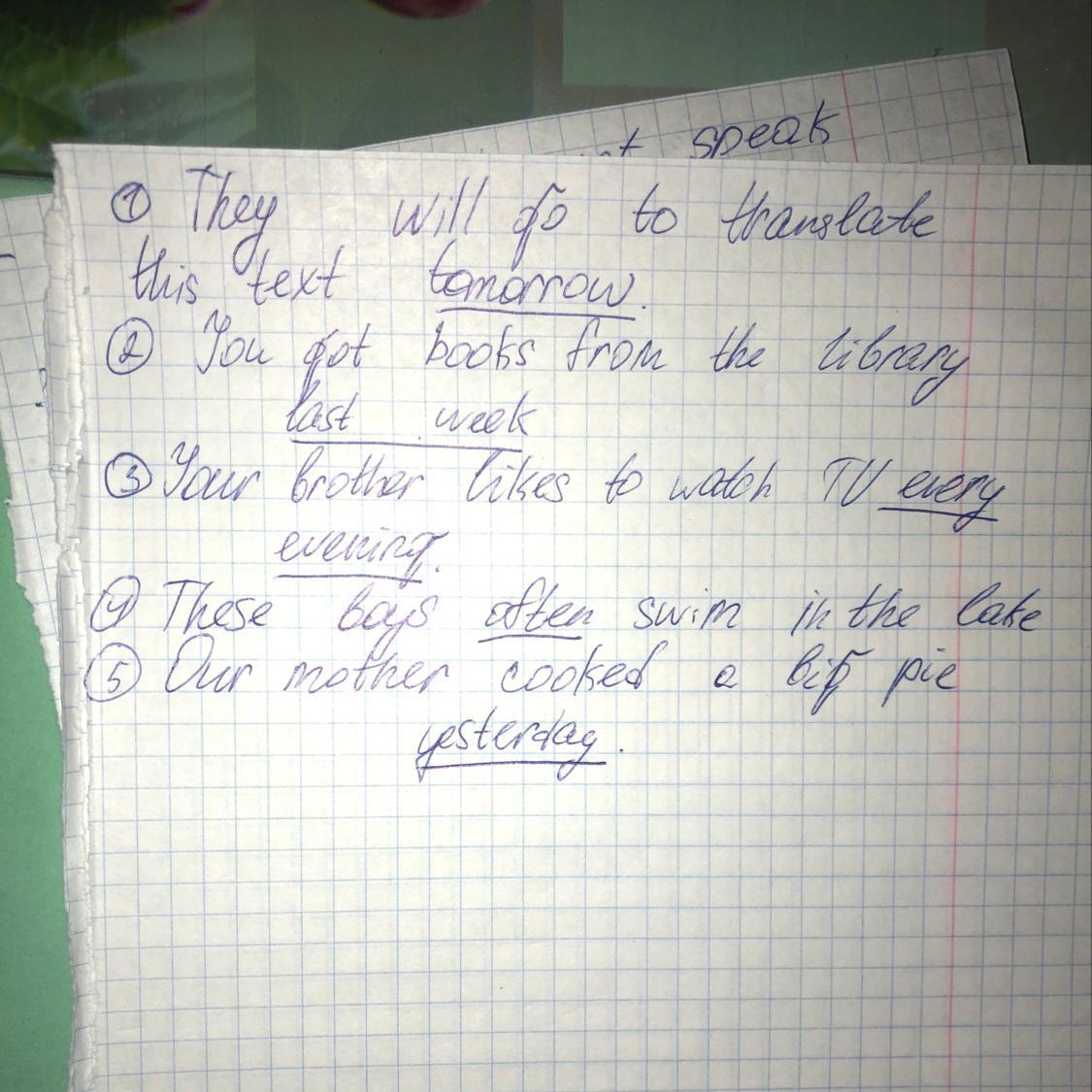 раскройте скобки и поставьте глагол в нужное время 1. They (to translate) this text tomorrow. 2. You (to get) books from the library last week. 3. Your brother (to like) to watch TV every evening. 4. These boys often (to swim) in the lake. 5. Our mother (cook) a big pie yesterday.