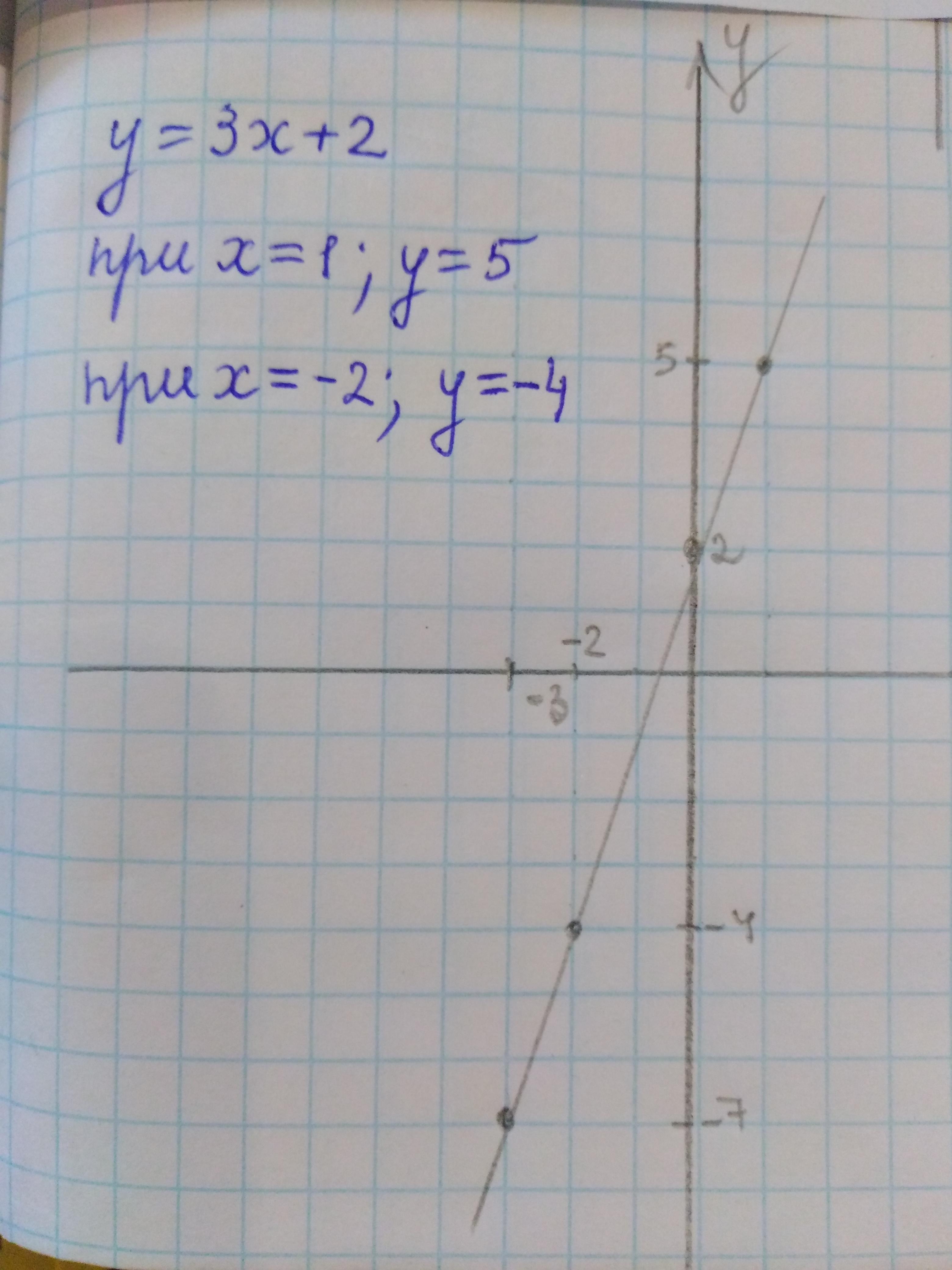 Постройте график функции, заданой формулой y=3x+2. Найдите по графику значение y соотвествующее x=1;-2