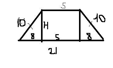 Боковые стороны равнобедренной трапеции 10 см . вычисли её площадь , если известно , что основы 5 см и 21 см !