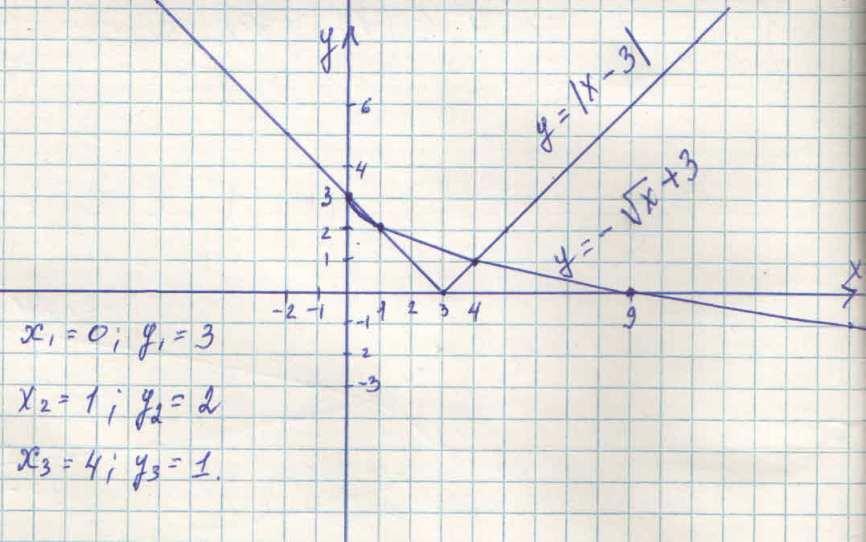 График функции y = -√x + 3 получается при симметричном отображении графика y = √x относительно оси OX и параллельным переносом его вдоль оси OY на +3 единицы.