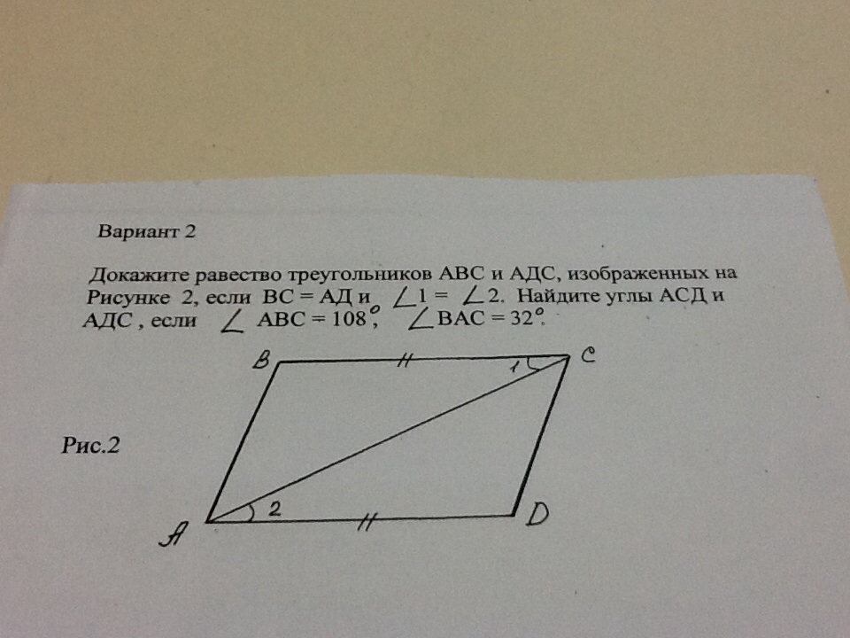 По условию ВС=АД , а угол 1= угол 2 . Угол АВС=108 , так как в параллелограмме противоположные углы равны , то угол АДС=108 . По второму признаку равенства треугольников сторона и два прилежащих к ней угла равны , значит треугольники равны .