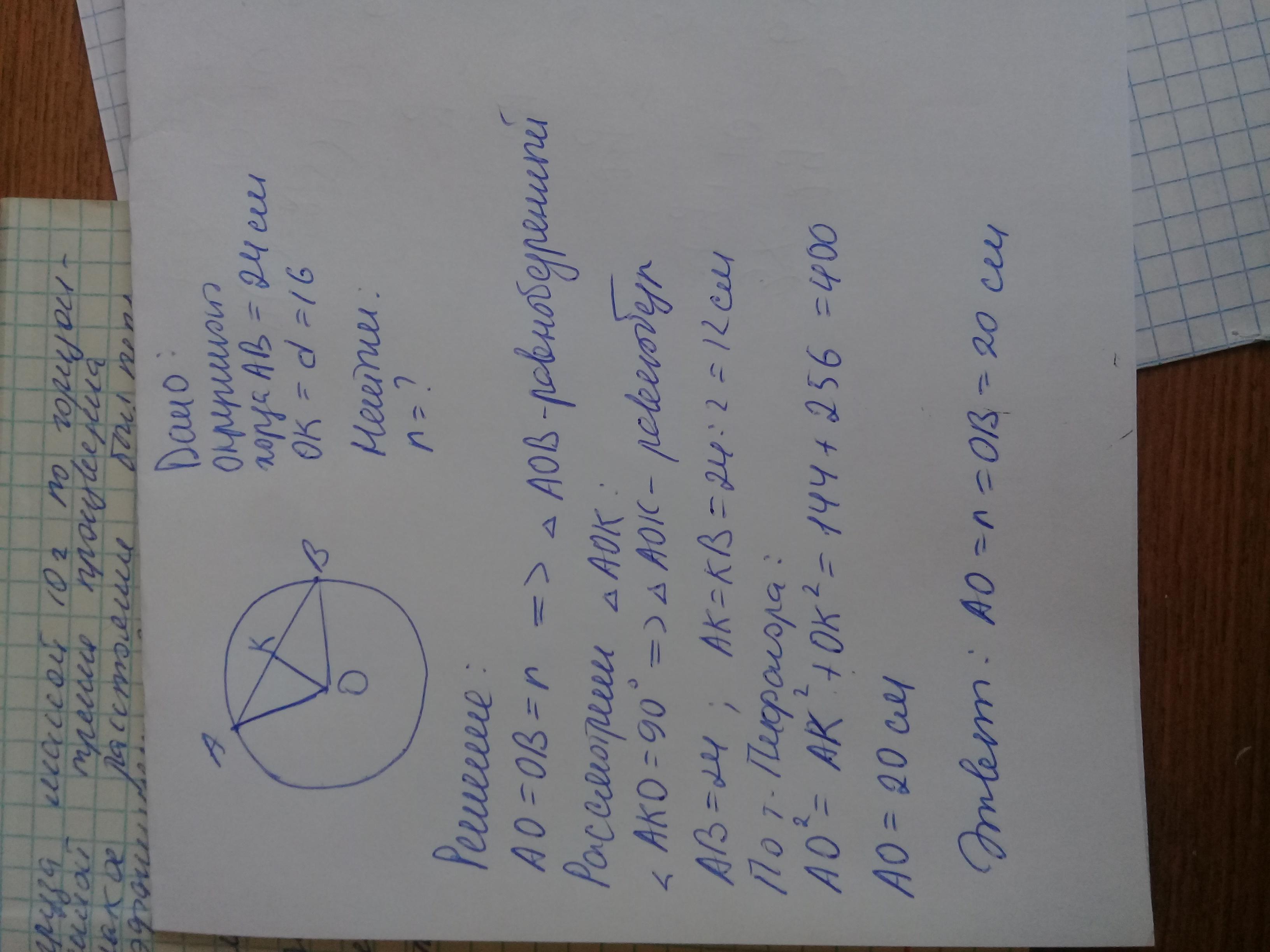 Задана окружность, d - расстояние от центра окружности до хорды AB. Вычислить r (радиус), если до ab=24 см, d=16. Нужно полное решение, можно с рисунком!
