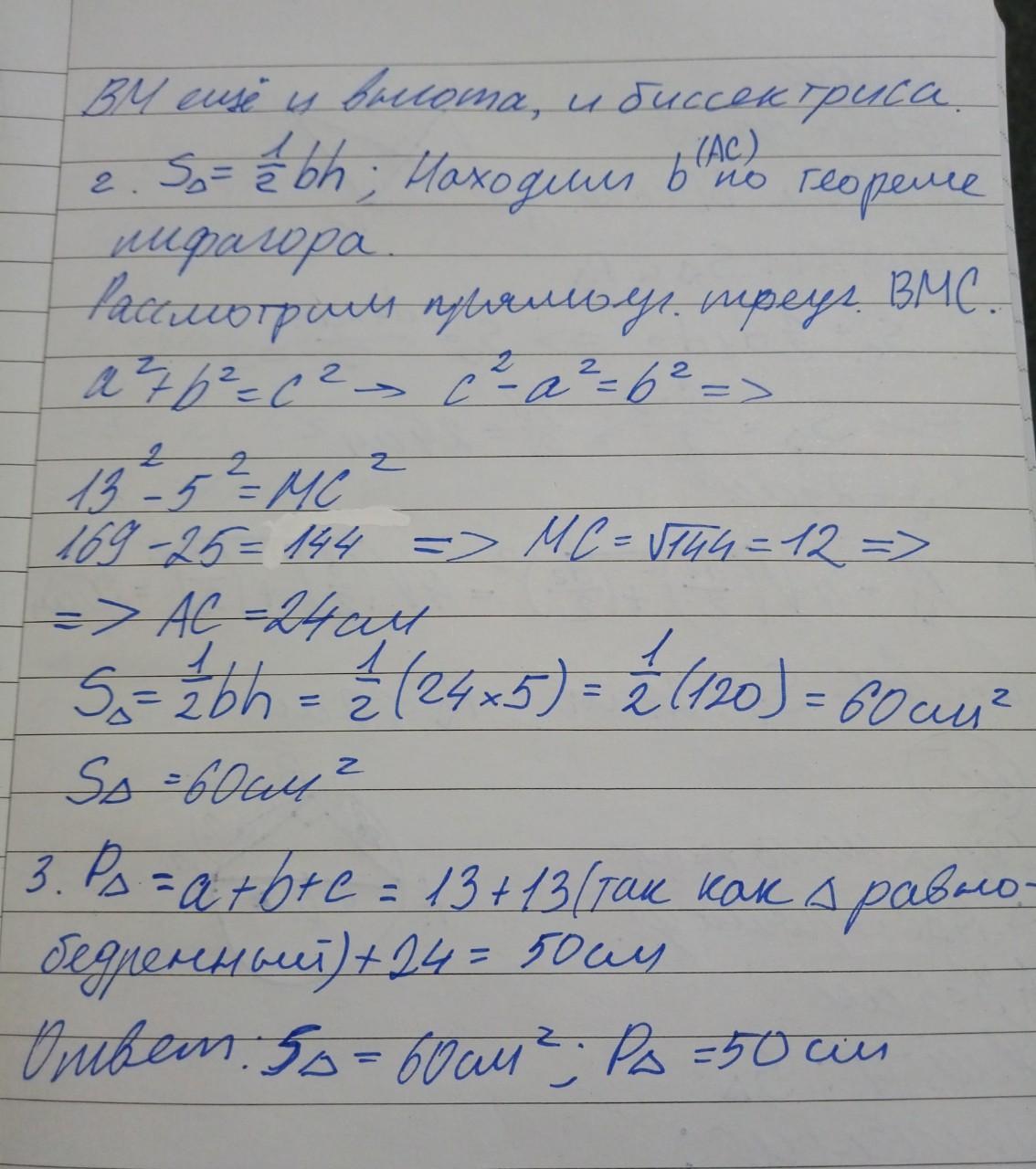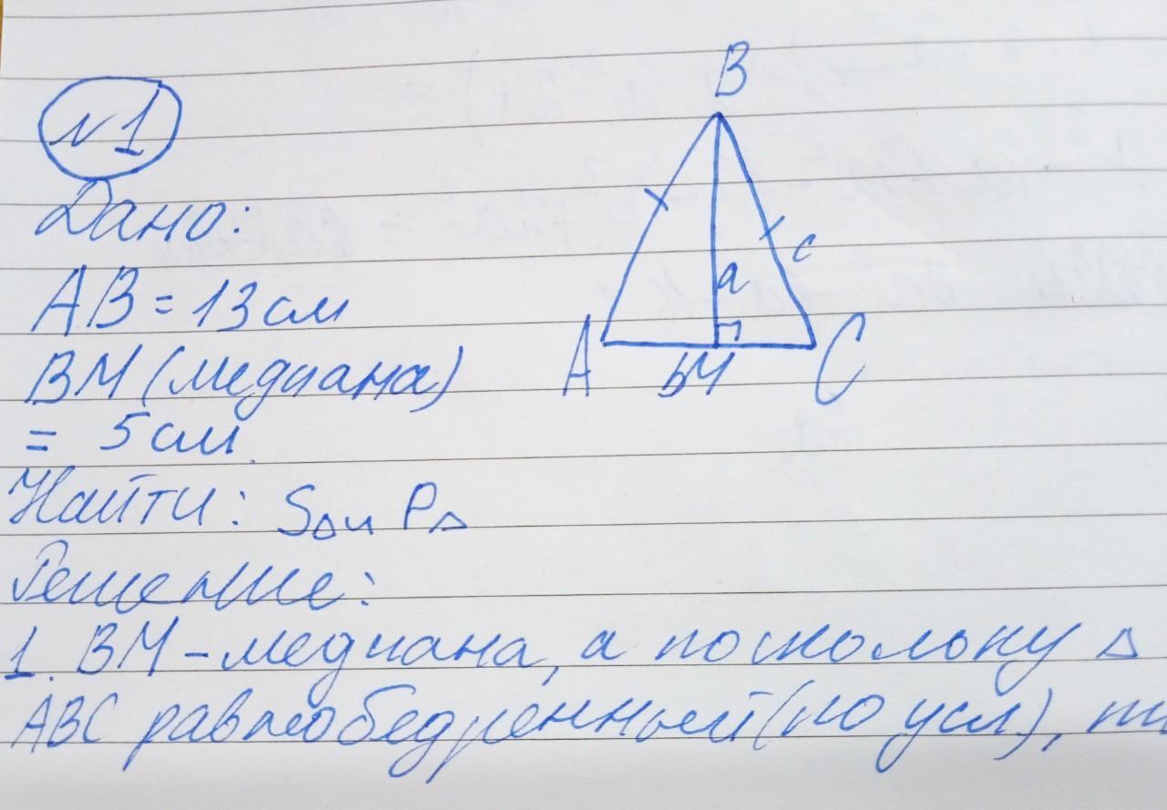 Боковая сторона равнобедренного треугольника равна 13 см, а его медиана, проведенная к основанию, равна 5 см. Найдите площадь и периметр треугольника.