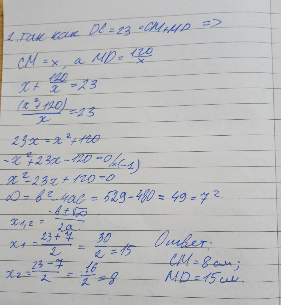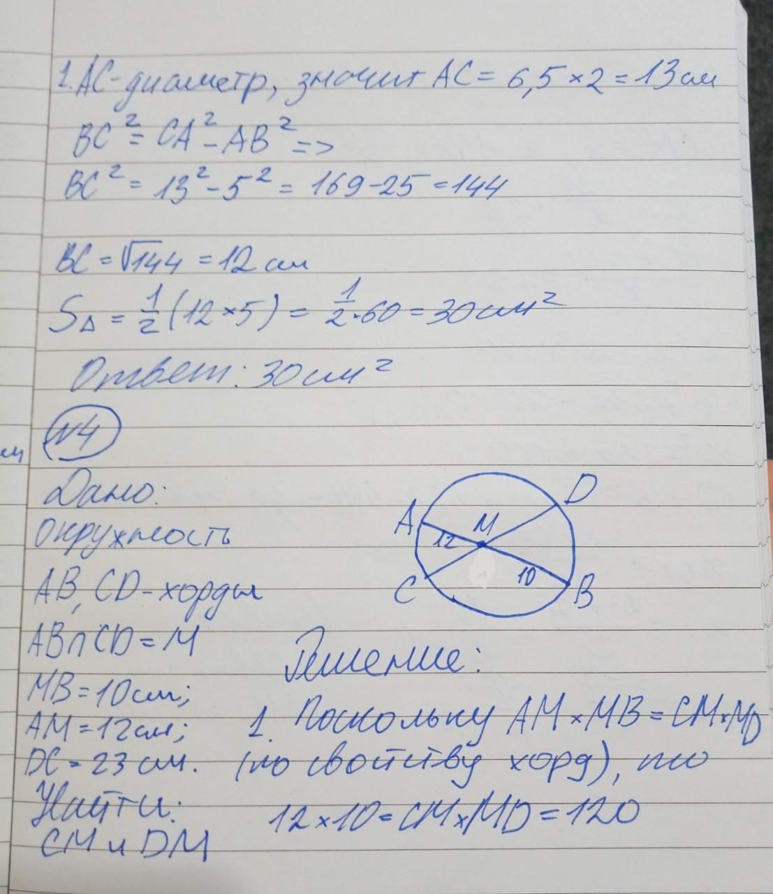 №4. В окружности проведены две хорды АВ и СD, пересекающиеся в точке М так, что МВ=10см, АМ=12 см, DС=23 см. Найдите длины СМ и DМ.