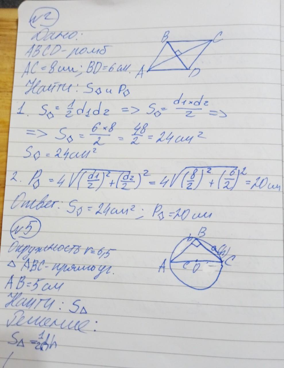 №2. Диагонали ромба равны 8 см и 6 см. Найдите периметр и площадь ромба.
