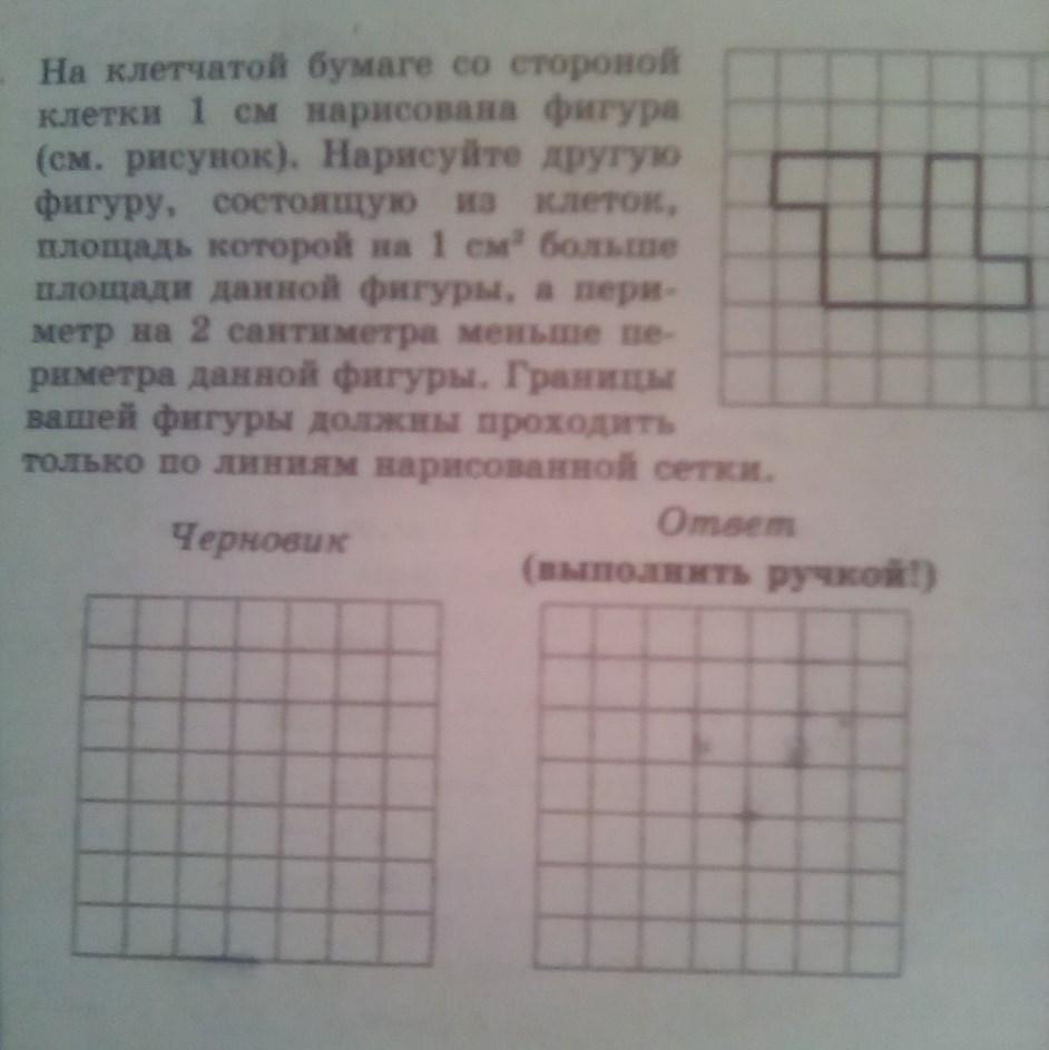 На клетчатой бумаге со стороной клетки 1 см нарисована фигура (см. Рисунок) Нарисуйте другую фигуру, состоящую из клеток, площадь которой на 1 см в квадрате больше площади данной фигуры, а периметр на 2 см. меньше периметра данной фигуры. Границы вашей фигуры должны проходить только по линиям нарисованной сетки
