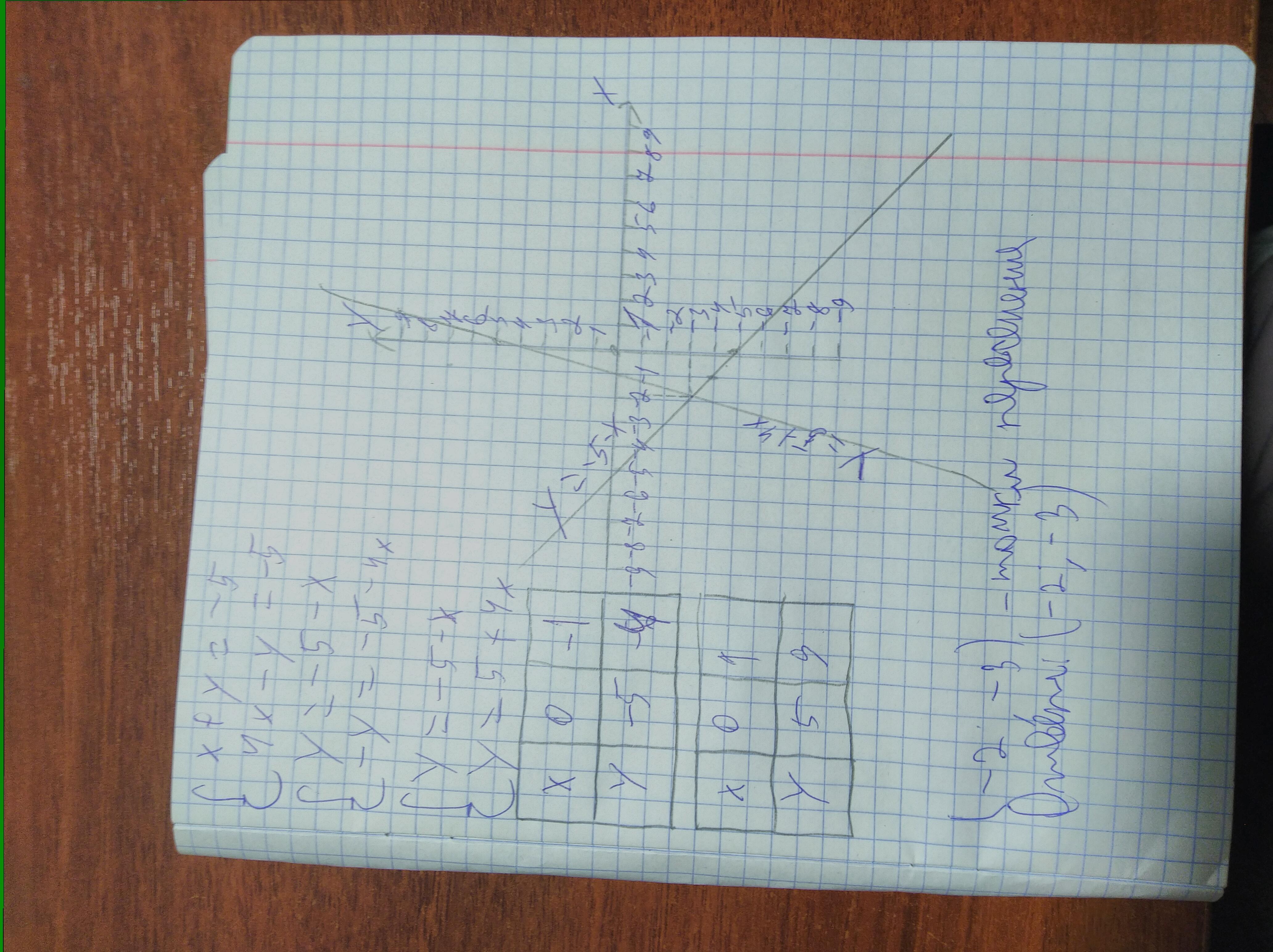 Объяснение: сначала выражаем переменные (любые), тоесть тот коэффициент что выражаем выставляем в левой части, а все остальное переносим в правую часть с пративоположным знаком, в данной системе легче выразить y. Когда мы выразили то строим две таблицы и берём 2 точки, в первом столбике где x пишем 0, теперь подставляем 0 в уравнение для которого таблица, решаем получившийся пример, результат записываем в первый столбик где y. Во 2 столбике где x придумываем свою точку, подставляем в уравнение это число, решаем получившийся пример, результат записываем во второй столбик в y (со 2 уравнением точно также). Строим систему координат, ставим точки которые у нас записаны в таблице и через эти точки проводим прямую, подписываем прямую (со 2 уважением точно также). В какой точке прямые пересекутся это и будет являться решением этой системы.