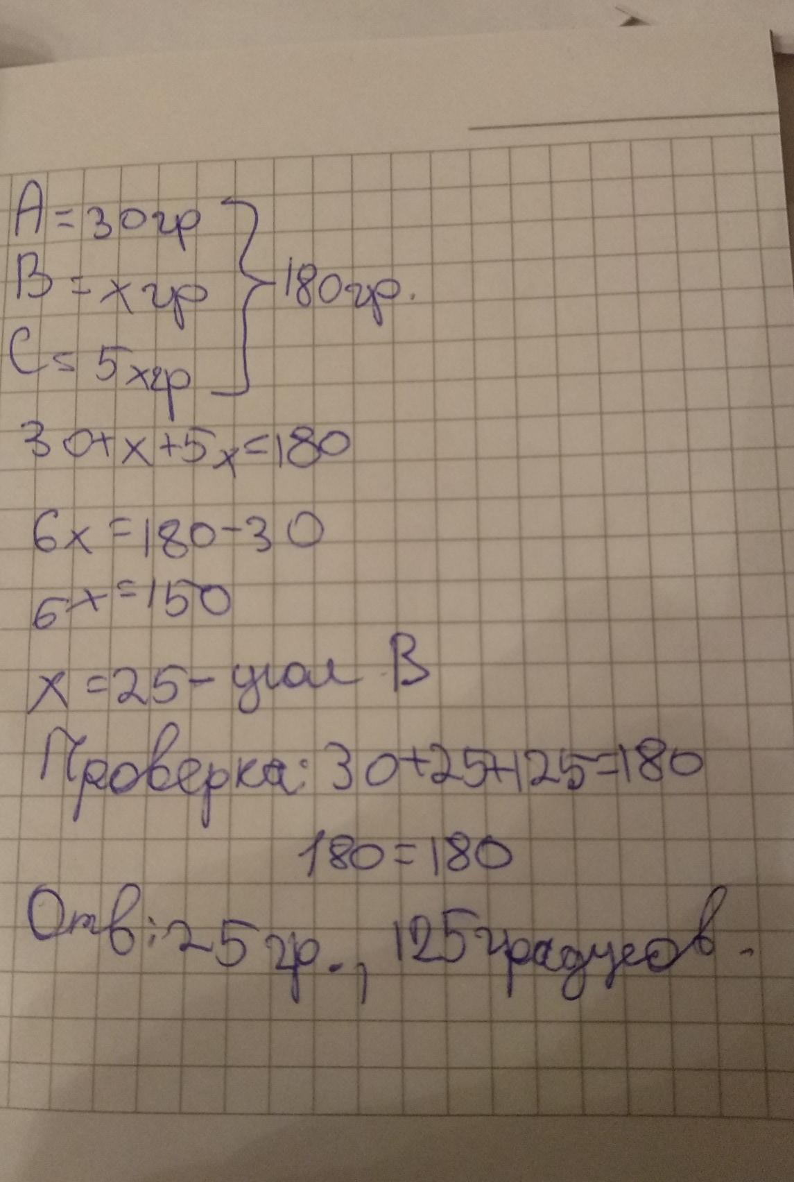 1 угол 30 градусов,значит 2 других вместе=180-30=150 градусов