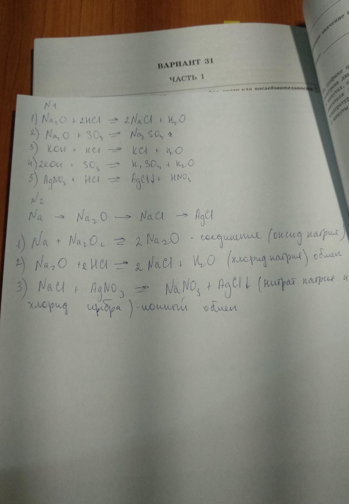 №1. Даны вещества: оксид натрия, соляная кислота, гидроксид калия, оксид серы (VI), нитрат серебра. Запишите все возможные уравнения реакций, если взять вещества попарно.
