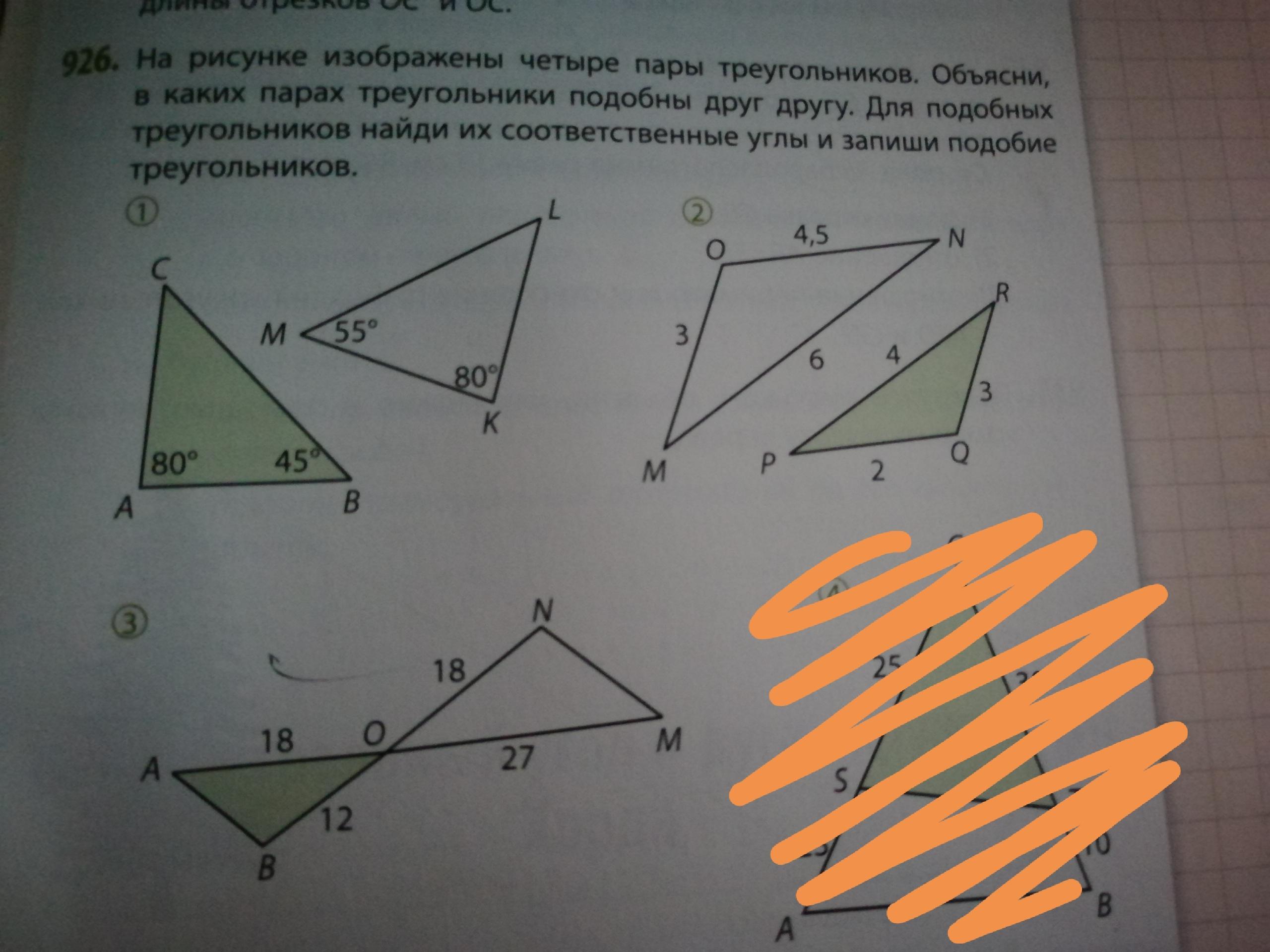 3) тр-ки подобны по 2-му прзнаку, < AOB=<MON( вертикальные), стороны пропорц-ны, OB/ON=AO/OM, 12/18=18/27=2/3