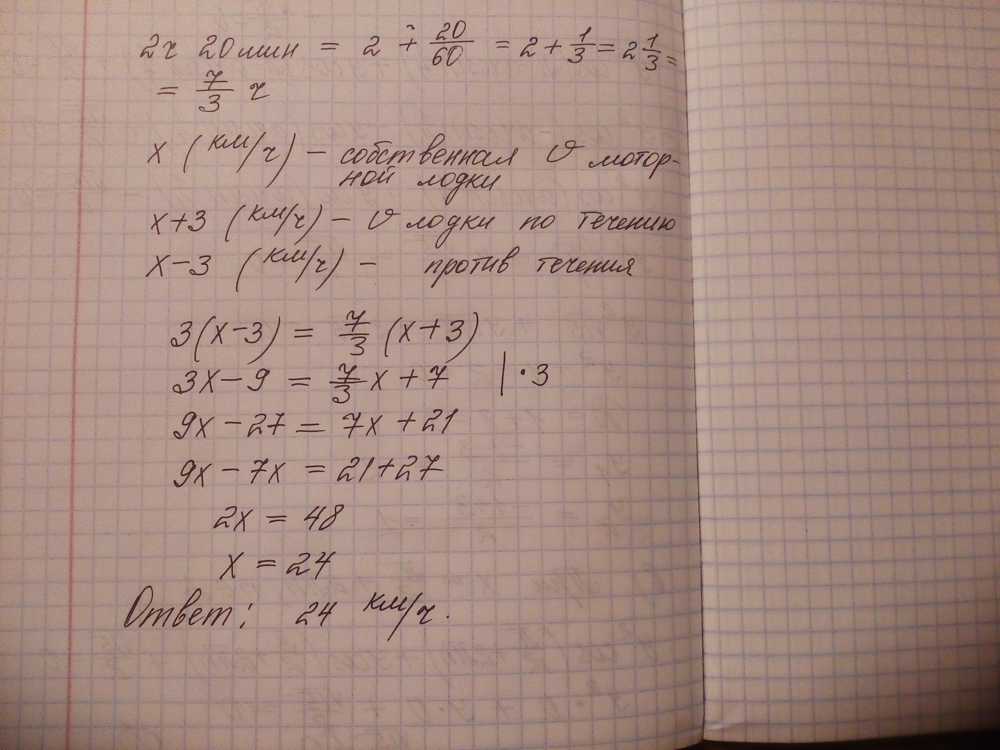 Помогите прошууууу, Моторная лодка, двигаясь против течения реки, прошла расстояние от турбазы до города за 3 часа, а обратный путь – за 2 часа 20 минут. Скорость течения реки равна 3 км/ч. Какова собственная скорость моторной лодки?