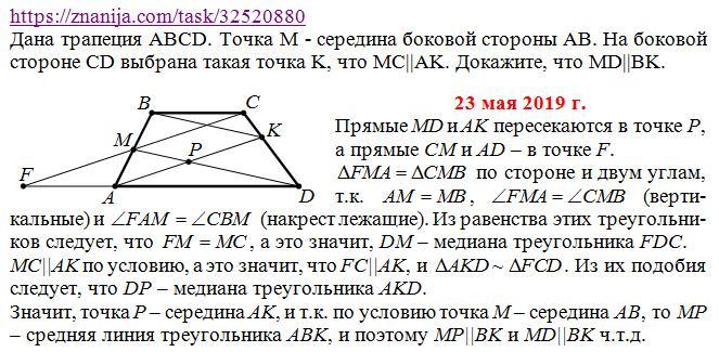 Дана трапеция ABCD. Точка M - середина боковой стороны AB. На боковой стороне CD выбрана такая точка К, что MC||AK. Докажите, что MD||BK